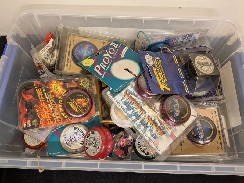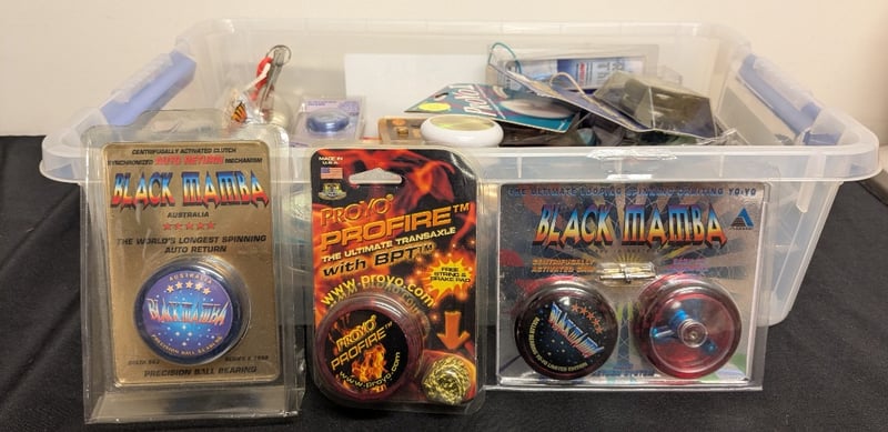 YO-YO COLLECTION - BLACK MAMBA AND PRO-YO MODELS IN STORAGE CONTAINER Comprehensive Collection Of Vintage Yo-Yos Featuring Multiple Black Mamba Models With Centrifugally Activated Clutch Mechanisms And Precision Ball Bearings, Alongside Pro-Yo Profire And Other Branded Yo-Yos. Includes Original Packaging, Instruction Materials, And Accessories. Collection Housed In Clear Plastic Storage Container With Compartmentalized Organization. Condition: Good - Refer To Images 584553+7