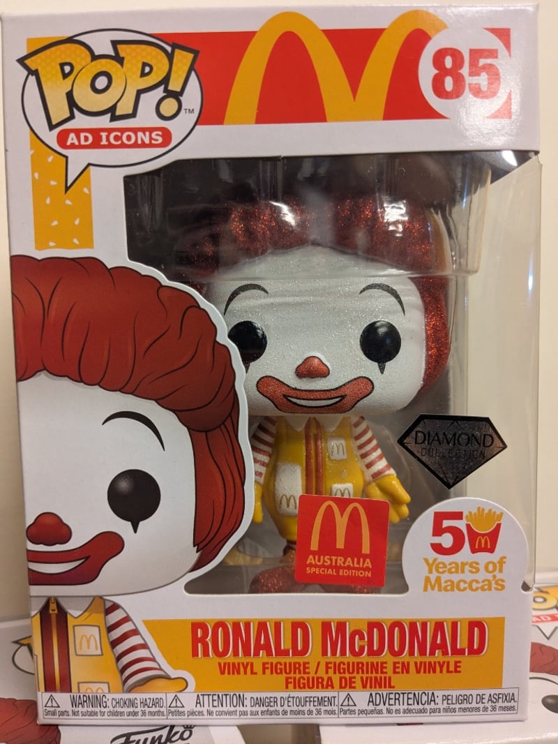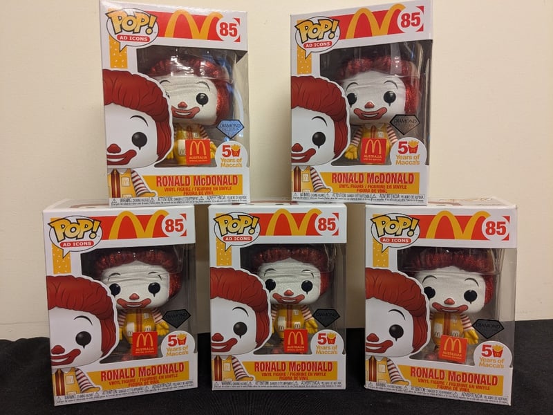 FUNKO POP! RONALD MCDONALD #85 AD ICONS COLLECTION - MCDONALD'S AUSTRALIA SPECIAL EDITION Collection Of Six Funko Pop! Vinyl Figures Featuring Ronald Mcdonald (Item #85) From The Ad Icons Series. Includes Multiple Standard Releases And One Diamond Collection Variant With Glitter Finish. All Figures Commemorate Mcdonald'S Australia 50 Years Of Maccas Milestone. Each Figure Displays Ronald'S Iconic Red And Yellow Costume With Characteristic Clown Makeup. Packaging Features Mcdonald'S Golden Arches Branding And Special Edition Australian Labeling. Diamond Collection Variant Distinguishe Condition: Good - Refer To Images 584553+9