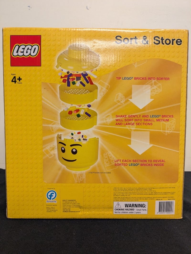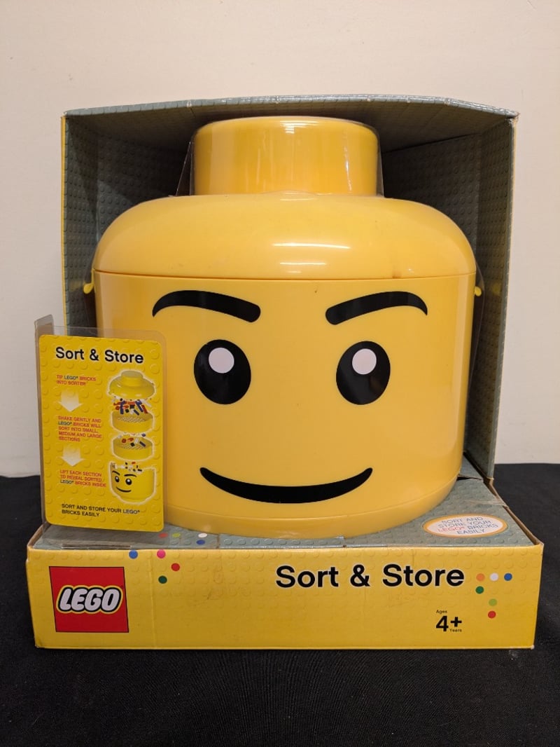 LEGO SORT & STORE HEAD CONTAINER - YELLOW MINIFIGURE DESIGN Vintage Lego Sort & Store Yellow Minifigure Head-Shaped Storage Container With Removable Lid And Stacking Compartments. Features Iconic Smiling Face Design With Black Eyes, Eyebrows, And Mouth. Includes Three Internal Sorting Trays With Mesh Dividers For Organizing Lego Bricks By Size. Original Packaging With Instruction Manual Included. Designed For Ages 4+. Manufactured By Futuristic/Lego. Condition: Good - Refer To Images 584553+15