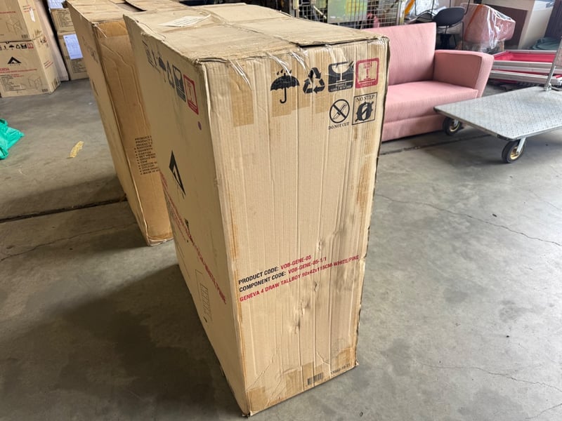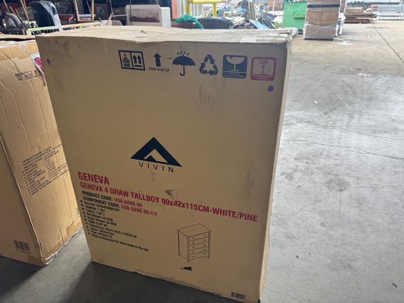 VIVIN Geneva 4-Drawer Tallboy in White/Pine finish. Flat-pack furniture featuring dimensions of 90cm width x 42cm depth x 115cm height. The piece showcases a contemporary design with clean lines and practical storage capacity across four substantial drawers. Suitable for bedroom, hallway or living spaces requiring vertical storage solutions.