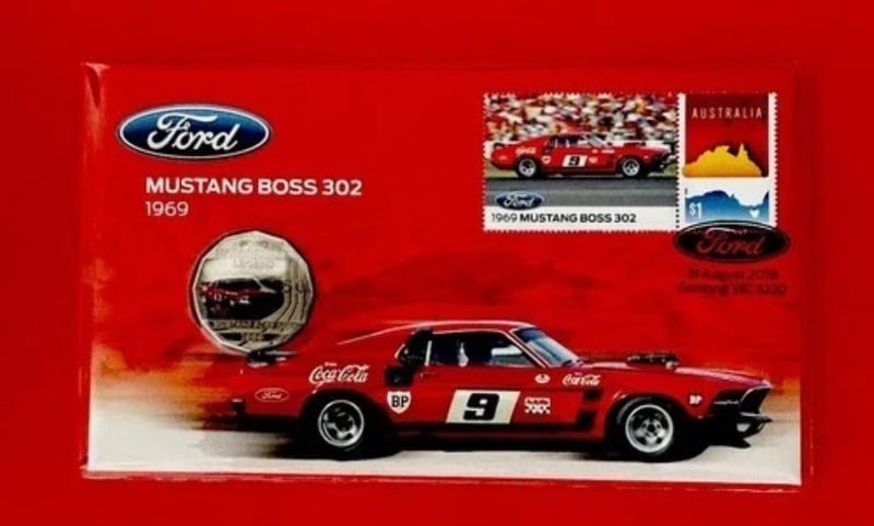 2018 AUSTRALIA 1969 FORD MUSTANG BOSS 302 50C FIFTY CENT COLOURED COIN PNC 294175+20