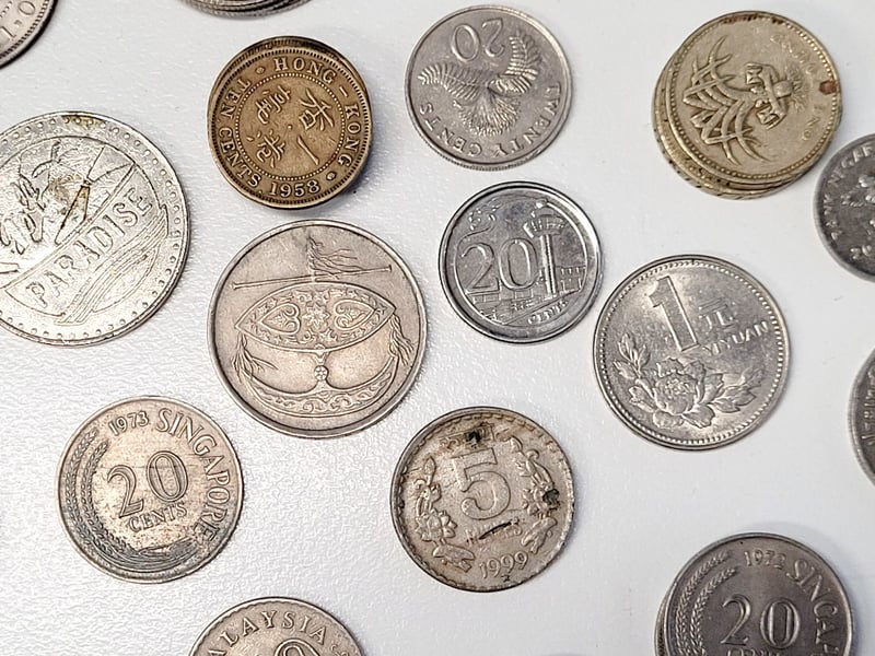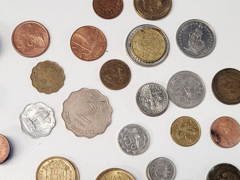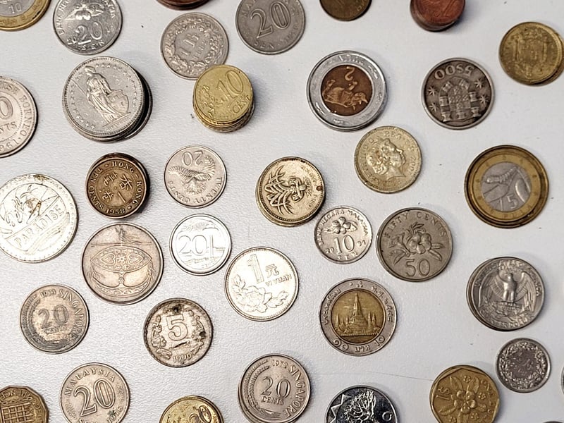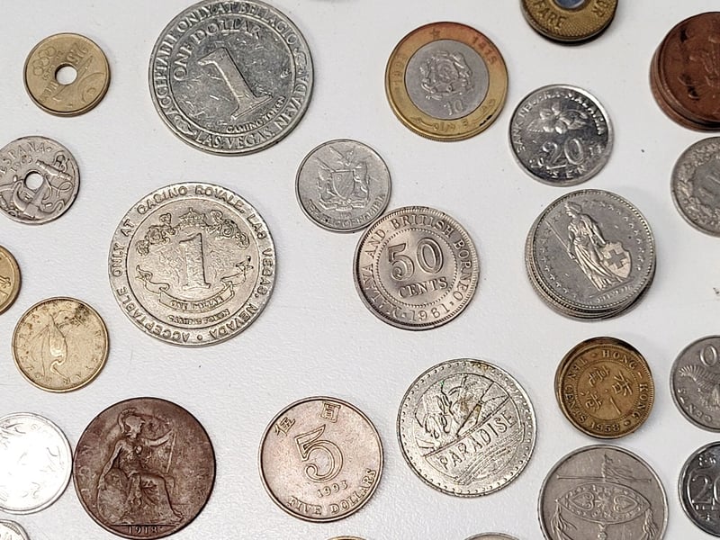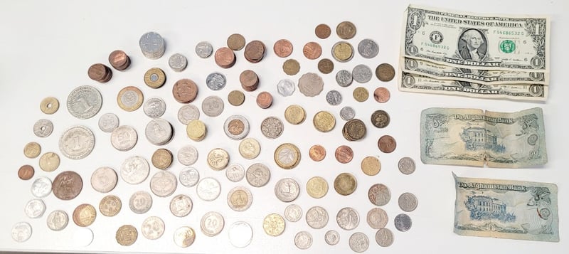 DIVERSE COLLECTION OF COINS AND BANKNOTES FROM DIFFERENT COUNTRIES.
