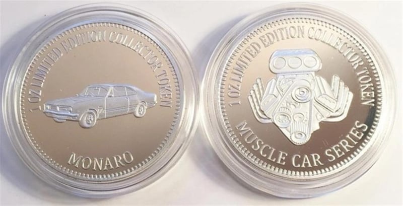 1 X ``HOLDEN MONARO`` MUSCLE CAR SERIES 1- 0Z HSE 999 FINE SILVER COIN/TOKEN LIMITED TO ONLY 2,500 WORLD WIDE. An Incredible New Array Of New Designs For Car Lovers, These New Muscle Cars Series Coins/Tokens Are Great To Collect, They Are A 1 Ounce Coin/Token 999 Fine Silver Heavy Gold Electroplate. They Are In Great Fresh Of The Mint Condition. Holden Monaro, Holden Slr 5000 Torana, Ford Gt Falcon, Shelby And Corvette. The Engine Is On The Back Of Each Design. 294177+5