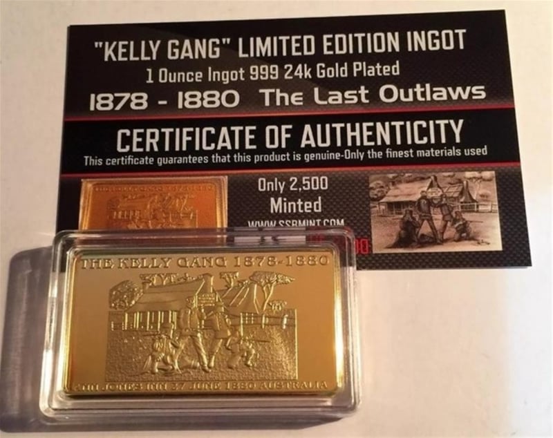 KELLY GANG`` AT ANN JONES INN 1OZ INGOT 999 24K GOLD PLATED CERTIFIED AND LTD 2500 You Are Buying The Awesome ``Kelly Gang`` At Ann Jones Inn 1 Oz Ingot, 999 24K Gold Plated With Certificate.The Front Of The Ingot Depicts A Sketch Of The Kelly Gang And Armor In Front Of Ann Jones Inn (Glenrowan Victoria). The Sketch Was Drawn By Famous Australian Artist John Harding. The Back Of The Ingot Has A Brief History Of The KellyGang:The Kelly Gang 1878-1880The Kelly Gang Was Formed In April 1878 And Consisted Of Ned Kelly, His Brother Dan Kelly, Joseph Byrne And Steve Hart. They Had Been On The Run From The Police After A Number Of Incidents When Their Luck Ran Out In GlenrowanVictoria, Australia. The Shootout Resulted In 3 Members Of The Gang Dead And Ned Kelly In Irons.They Are Limited To A Very Low 2500 World Wide. These Awesome ``Kelly Gan`` Ingots Are Minted In Australia. They Will Sell Fast Secure Yours Today. Don`T Miss Out.This Great Product Is Awesome For Display, Fun To Collect Or Would Make A Very Unique Christmas Or Birthday Present 294177+6