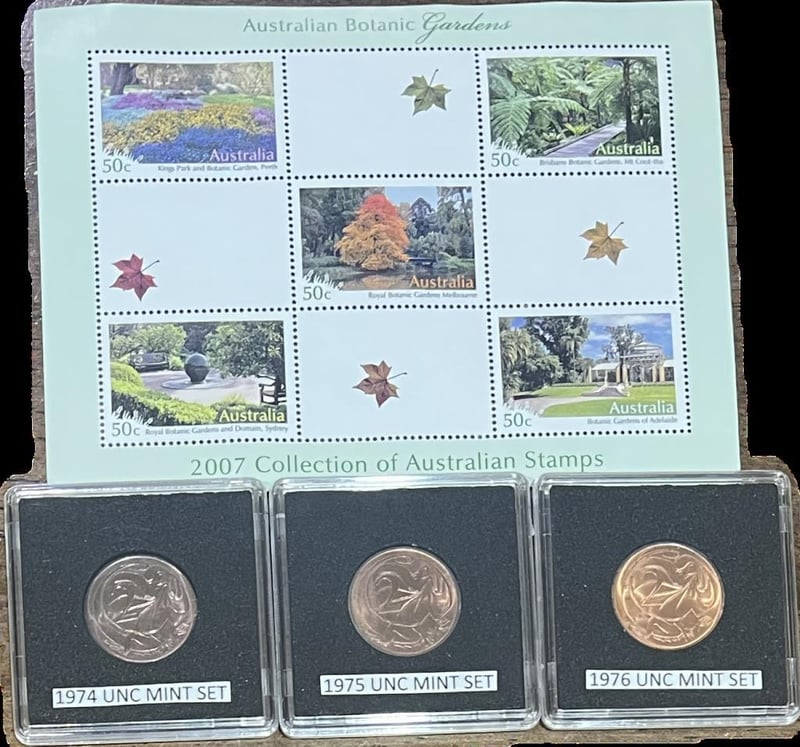 1974/1975/1976 AUSTRALIA 2 CENTS UNC IN BLACK CASE PLUS 2007 AUSTRALIAN UNC STAMP UNCUT 50C X 5…HIGH VALUE 294177+11