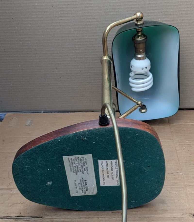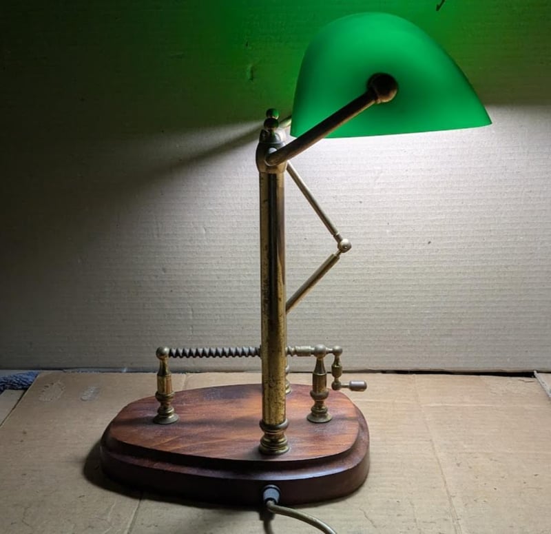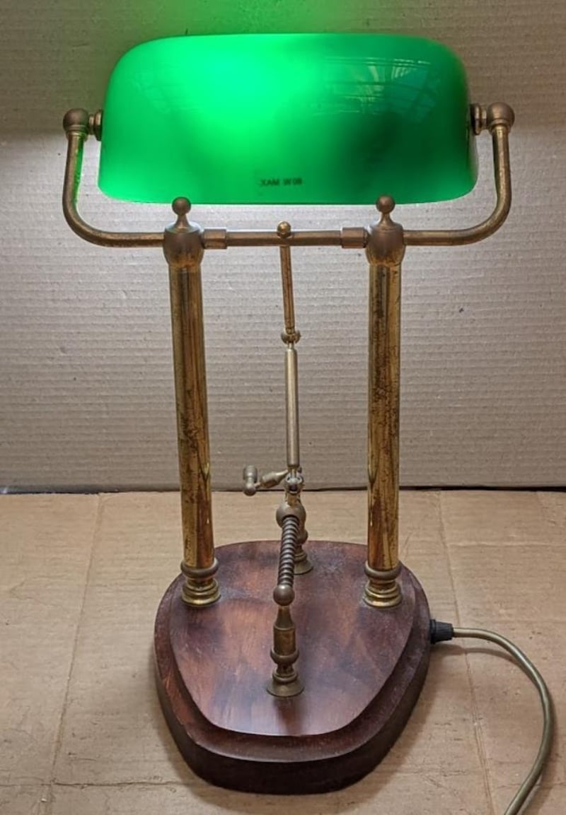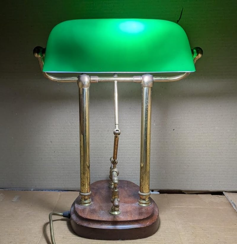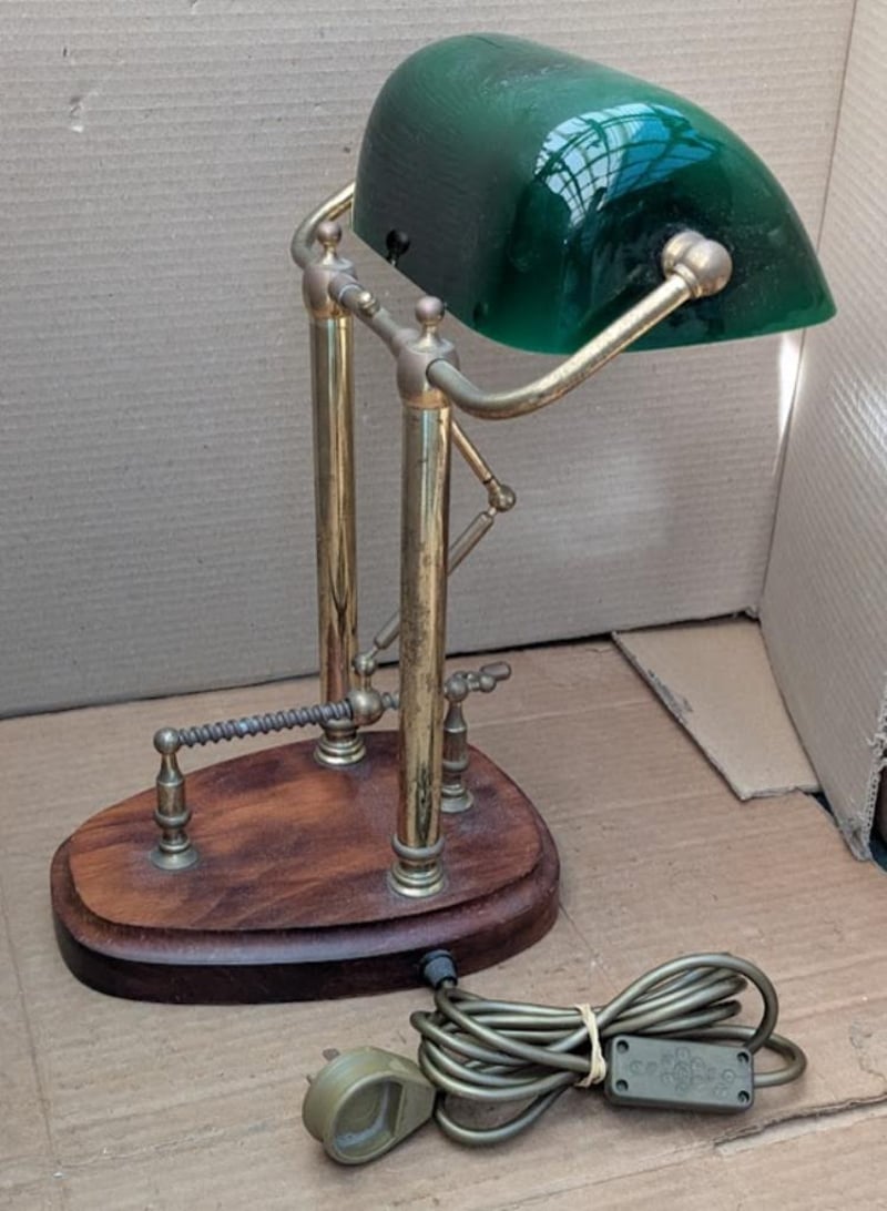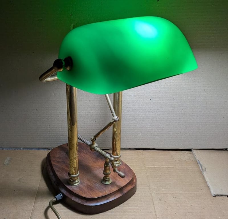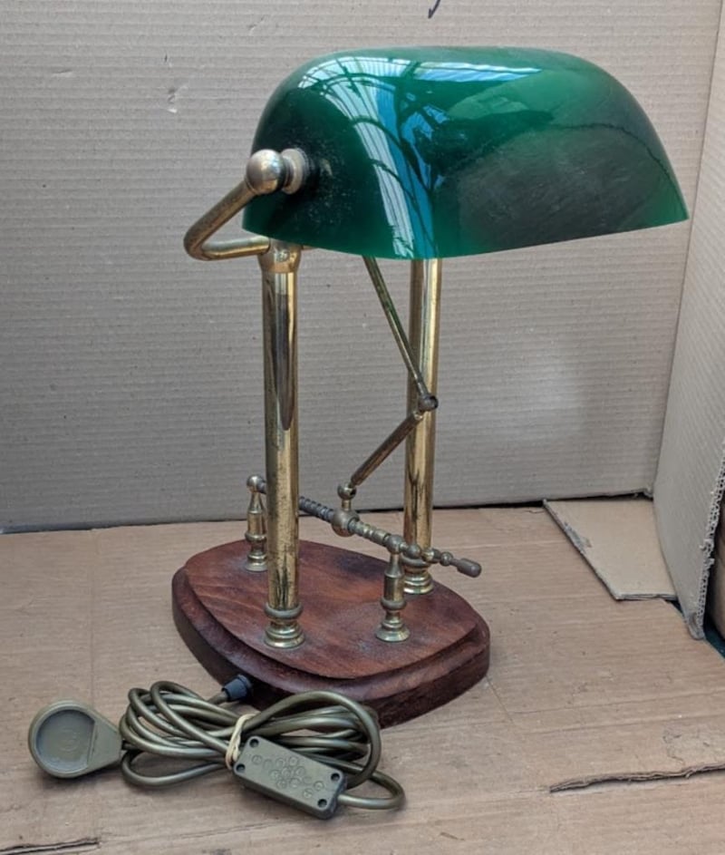 VINTAGE BANKERS DESK LAMPBrass And Wood Frame, Green Opaline Glass Shade Size: 37 X 27 X 27cm Condition: Good - Refer Images582952+5