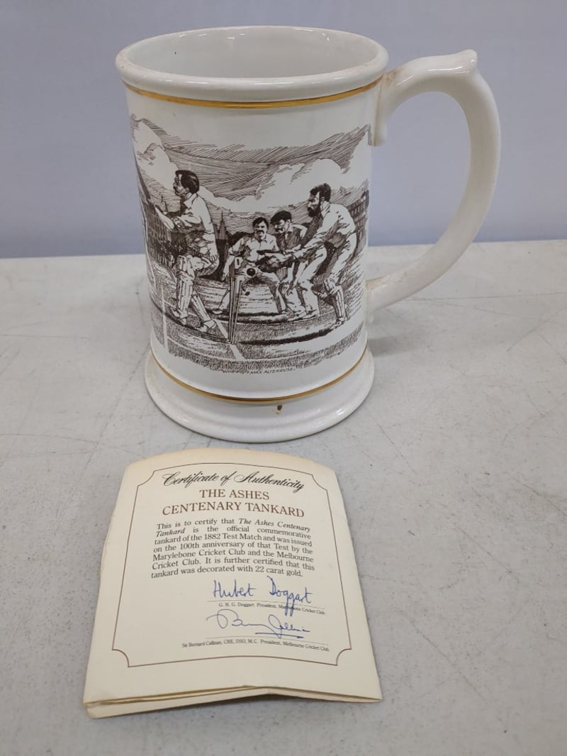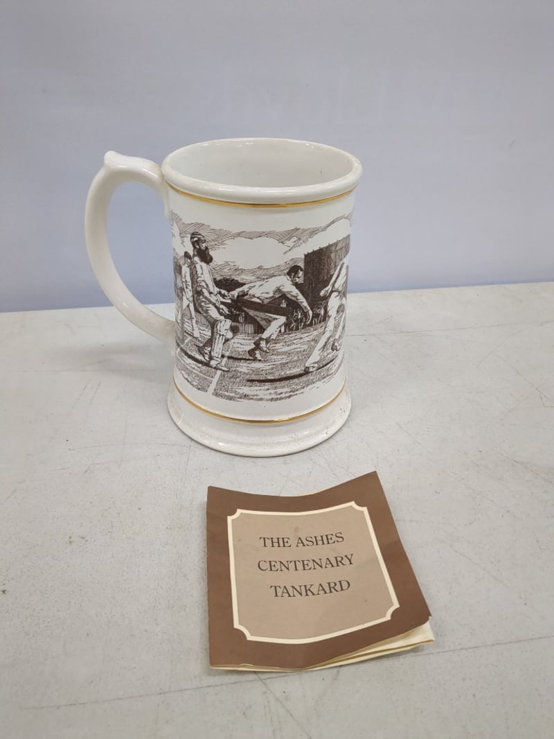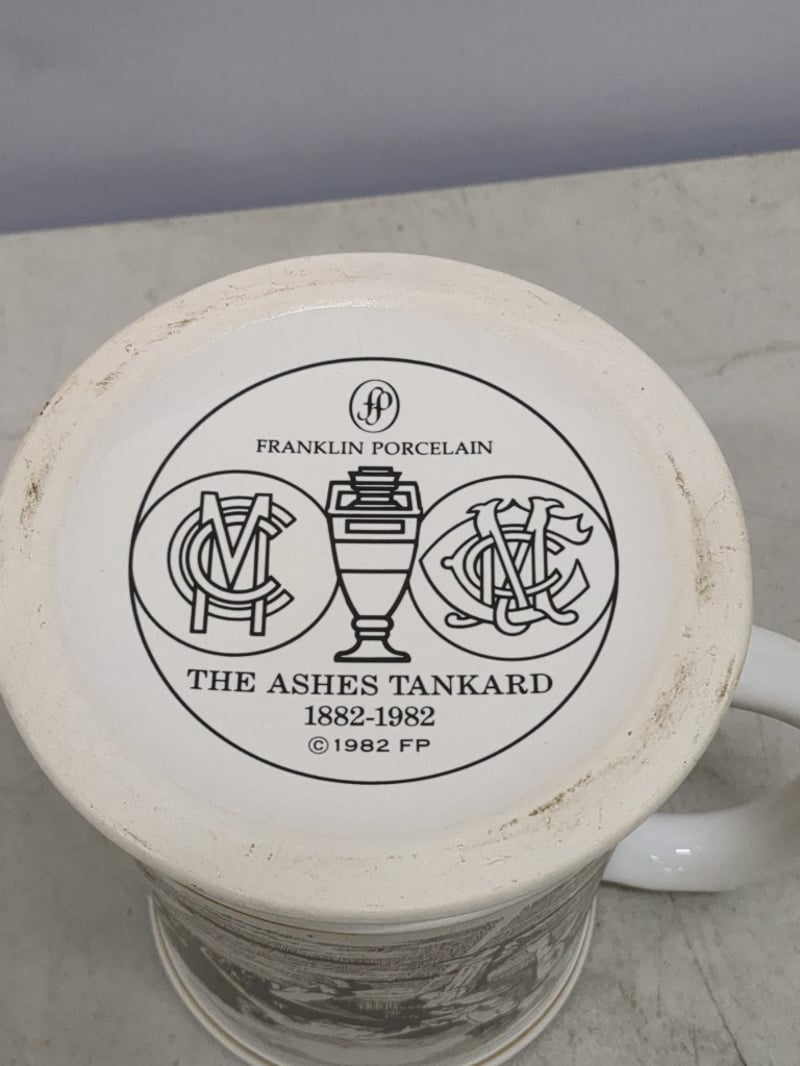 THE ASHES CENTENARY TANKARD - FRANKLIN PORCELAIN 1882-1982Item Size: Height: 17cm, Width: 12cm, Depth: 17cm, Weight: 0.5KgOfficial Commemorative Porcelain Tankard Issued By Franklin Porcelain Celebrating The 100Th Anniversary Of The Ashes Cricket Series. Features Sepia-Toned Engraved Imagery Depicting Historical Cricket Scenes On Cream-Coloured Porcelain With Gilt Trim. Marked With Mcc And Acb Crests. Accompanied By Certificate Of Authenticity Noting 22-Carat Gold Decoration. Limited Edition Commemorative Piece From 1982.Condition: Good - Refer To Images587948+3