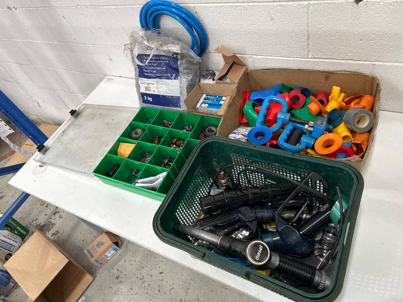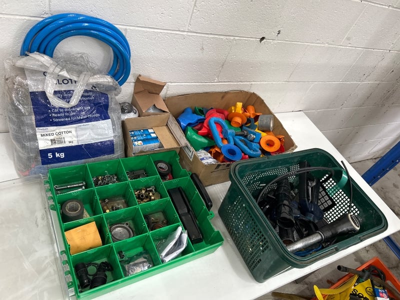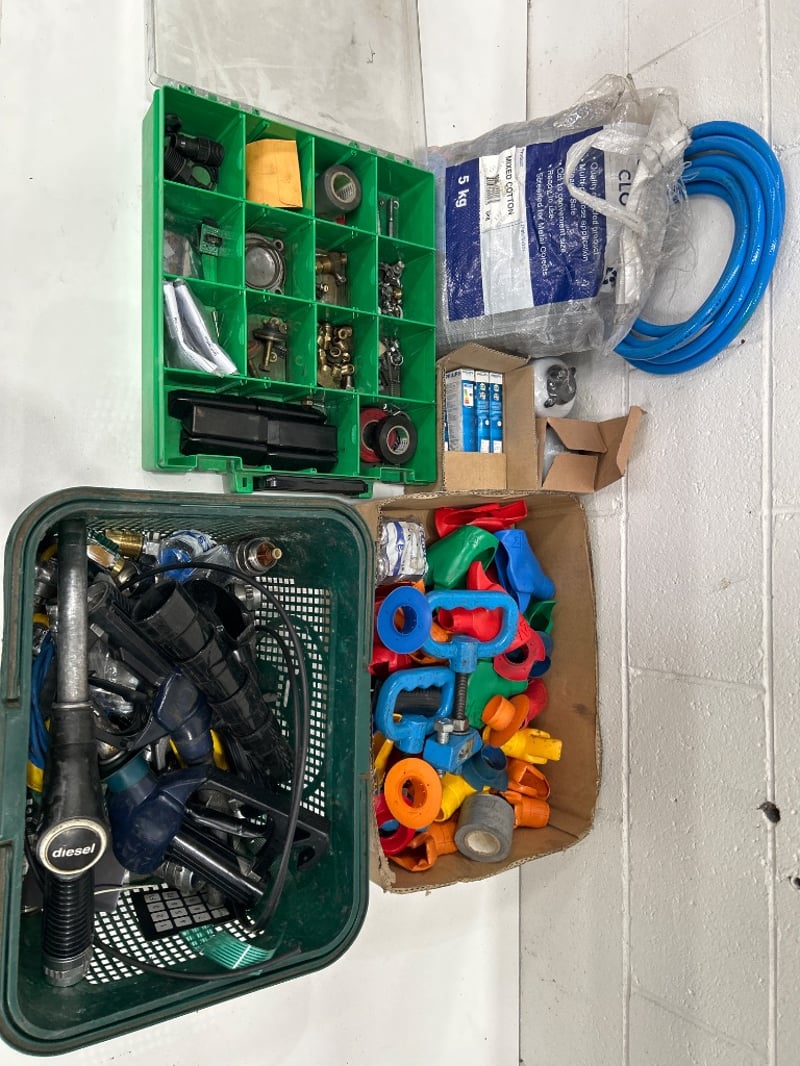 Industrial air tool hose, 9w light bulbs, Fuel filters Donaldson Nuts & bolts, Clamps, Bowser pumps & fittings & more Sold as lot