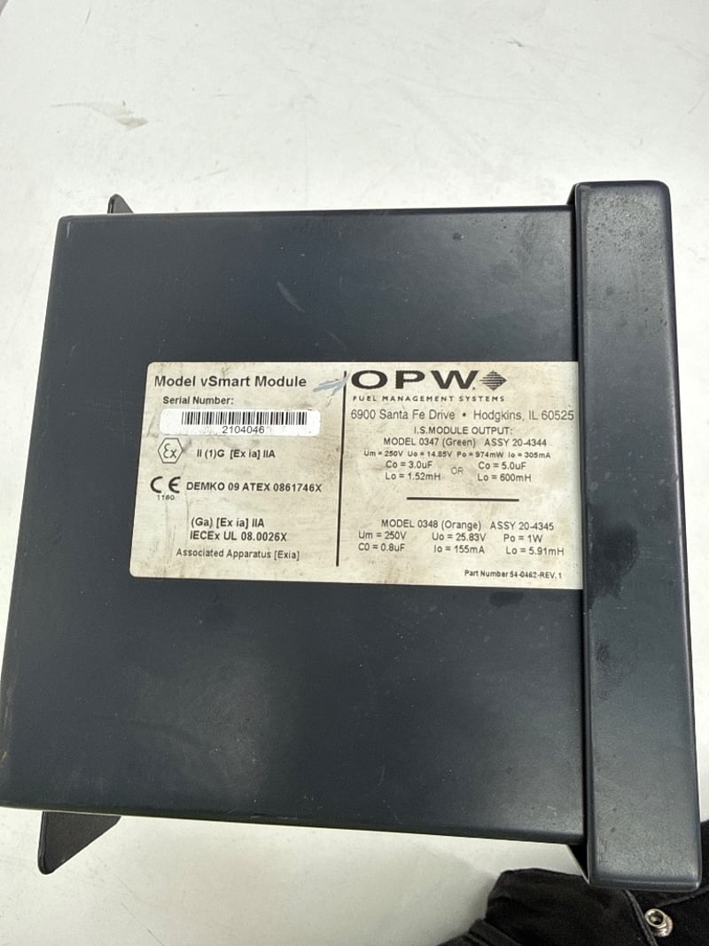 Fuel Management System, OPW, vSmart Module, Serial: 2104046, 6900 Santa Fe Drive, Hodgkin IL 60525. Approx Dimensions: 30H x 16W x 20D Note: Missing key to unlock