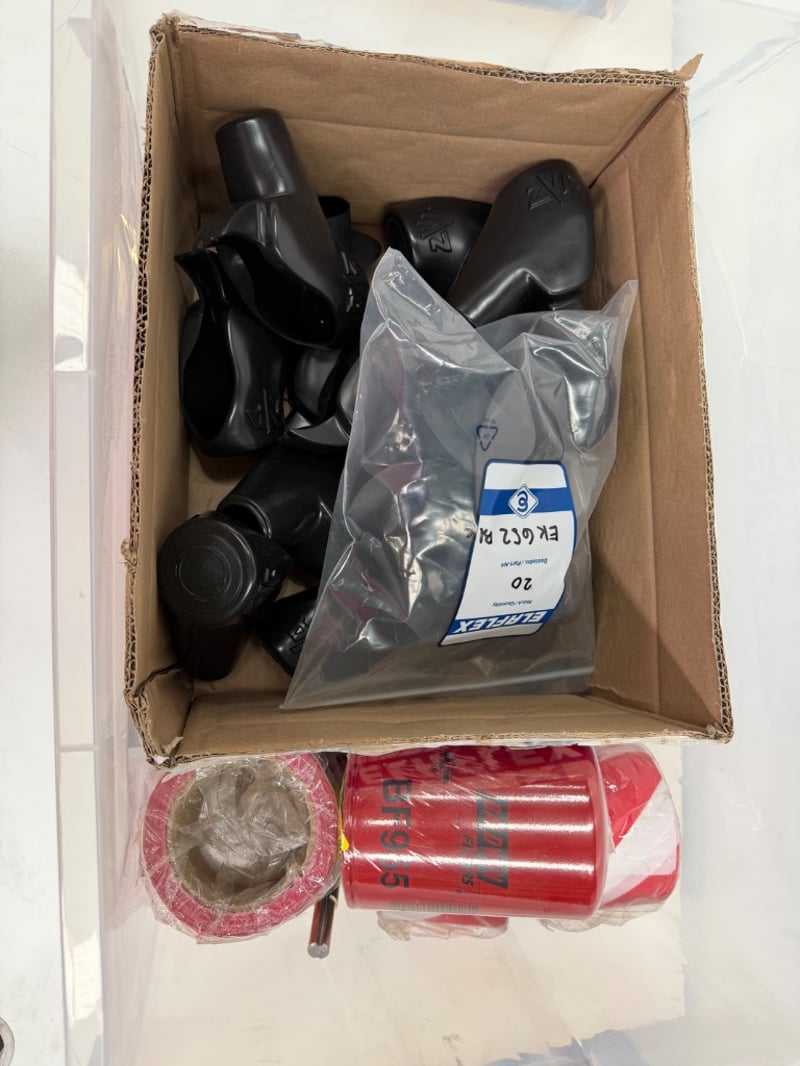 Assorted box of fuel filter Baldwin BF955, fuel nozzle cover , fittings and more
