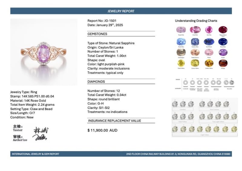 14CT ROSE GOLD PINK CEYLON SAPPHIRE AND DIAMOND DRESS RING Featuring Centre, One Oval Cut, Light Purplish-Pink Ceylon Sapphire (1.00Ct, Moderate Inclusions), Claw Set, With 12 Round Brilliant Cut Diamonds (0.04Ct Tdw, G-H Colour, Si1-Si2 Clarity), Bead Set. Ring Size O. Valuations Provided by an Independent Third-Party Professional Not Directly Associated With Lloyds Auctions at AUD $11900This valuation has been conducted by an independent third-party professional. The valuation amount is an assessment by the issuing valuer and does not reflect the auction value of the item. Any inquiries regarding the valuation should be directed to the issuing valuer (refer to contact details on the certificate), as Lloyds Auctions has no affiliation or influence over the valuation, the valuer, or the stated amount. Condition: Good - Refer Images 0584555+2206