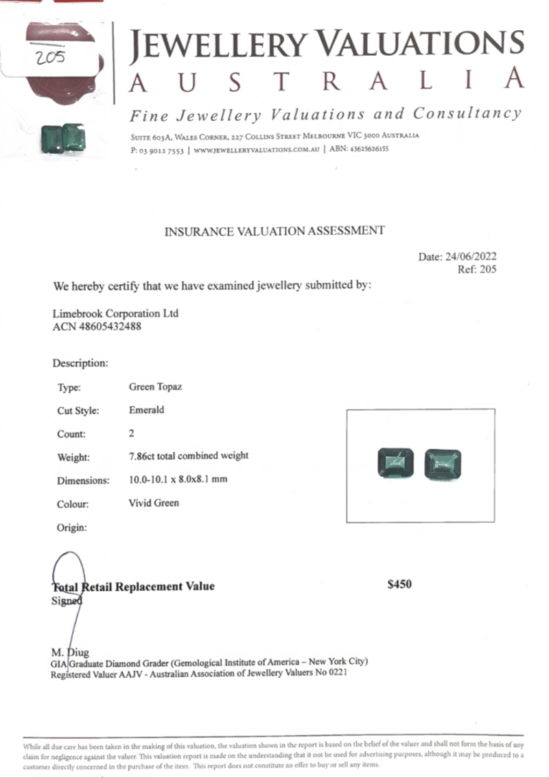 7.86TCW GREEN TOPAZ. 2 PCS. ADDITIONAL GIFT CARD $50, OURGIFT2U. 2 Pcs. Accompanied By Insurance Valuation Assessment And $50 Ourgift2U Gift Card. Cut Style: Emerald. Colour: Vivid Green. 10-10.1Mm X 8-8.1Mm Condition: Good - Refer To Images This valuation has been conducted by an independent third-party professional. The valuation amount is an assessment by the issuing valuer and does not reflect the auction value of the item. Any inquiries regarding the valuation should be directed to the issuing valuer (refer to contact details on the certificate), as Lloyds Auctions has no affiliation or influence over the valuation, the valuer, or the stated amount. Insurance Replacement Valuation Amount: $450.00 FC 162991+16