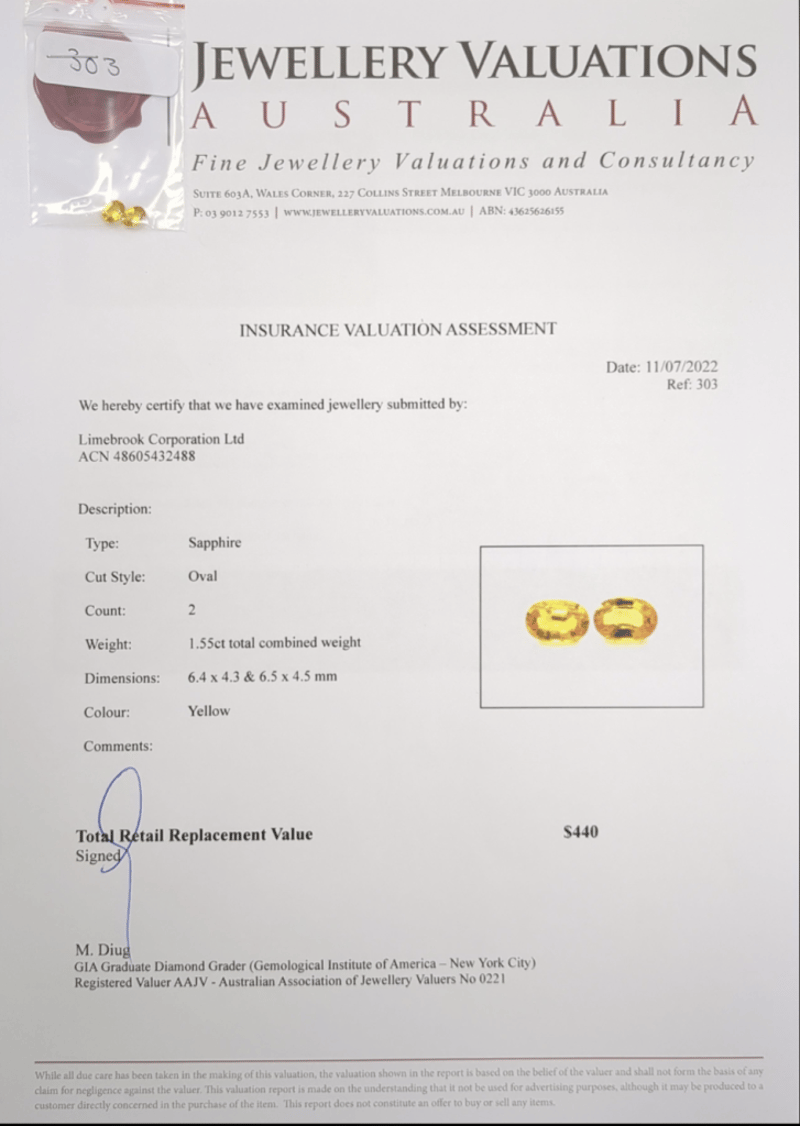 1.55TCW OVAL SAPPHIRES 2 PCS. ADDITIONAL GIFT CARD $50, OURGIFT2U. 2 Pieces. Accompanied By Insurance Valuation Assessment And $50 Gift Card, Ourgift2U. Colour: Yellow. Condition: Good - Refer To Images This valuation has been conducted by an independent third-party professional. The valuation amount is an assessment by the issuing valuer and does not reflect the auction value of the item. Any inquiries regarding the valuation should be directed to the issuing valuer (refer to contact details on the certificate), as Lloyds Auctions has no affiliation or influence over the valuation, the valuer, or the stated amount. Insurance Replacement Valuation Amount: $440.00 FC 162991+24