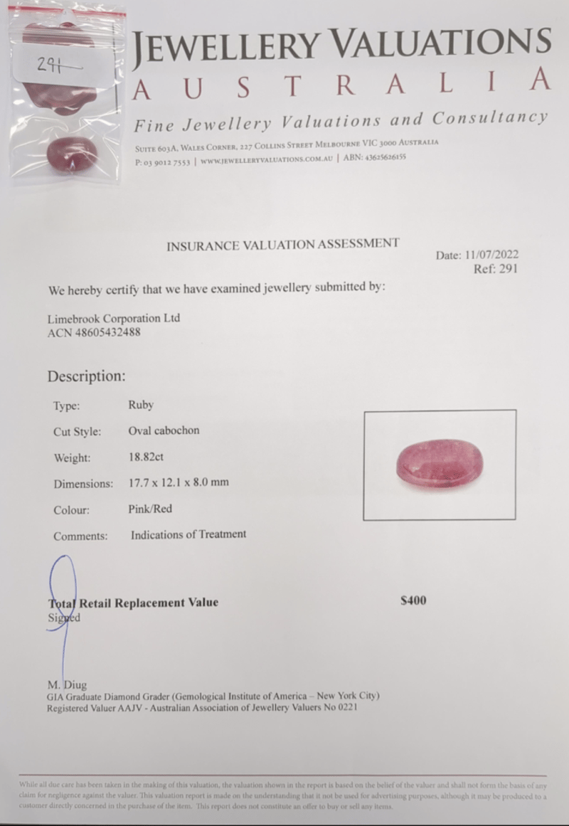 18.82CT PINK OVAL RUBY. ADDITIONAL GIFT CARD $50, OURGIFT2U. Accompanied By Ourgift2U Gift Card $50 And Insurance Valuation Assessment. Colour: Pink/Red. Cut: Oval Cabochon Dimensions: Height: 17.70mm, Width: 12.10mm, Depth: 8.00mm Condition: Good - Refer To Images This valuation has been conducted by an independent third-party professional. The valuation amount is an assessment by the issuing valuer and does not reflect the auction value of the item. Any inquiries regarding the valuation should be directed to the issuing valuer (refer to contact details on the certificate), as Lloyds Auctions has no affiliation or influence over the valuation, the valuer, or the stated amount. Insurance Replacement Valuation Amount: $400.00 FC 162991+11
