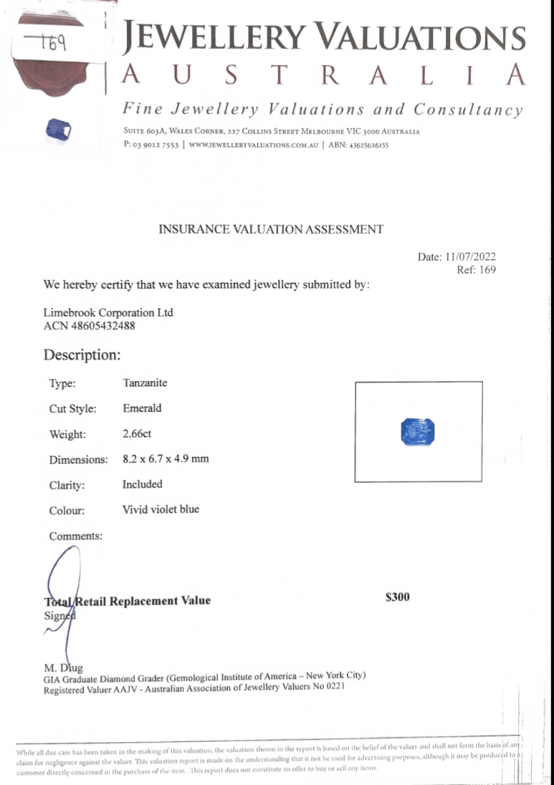 2.66CT EMERALD TANZANITE. ADDITIONAL $25 GIFT CARD, OURGIFT2U. Accompanied By Insurance Valuation Assessment And $25Gift Card, Ourgift2U. Clarity: Included. Colour: Vivid Violet Blue. Dimensions: Height: 8.20mm, Width: 6.70mm, Depth: 4.90mm Condition: Good - Refer To Images This valuation has been conducted by an independent third-party professional. The valuation amount is an assessment by the issuing valuer and does not reflect the auction value of the item. Any inquiries regarding the valuation should be directed to the issuing valuer (refer to contact details on the certificate), as Lloyds Auctions has no affiliation or influence over the valuation, the valuer, or the stated amount. Insurance Replacement Valuation Amount: $300.00 FC 162991+46