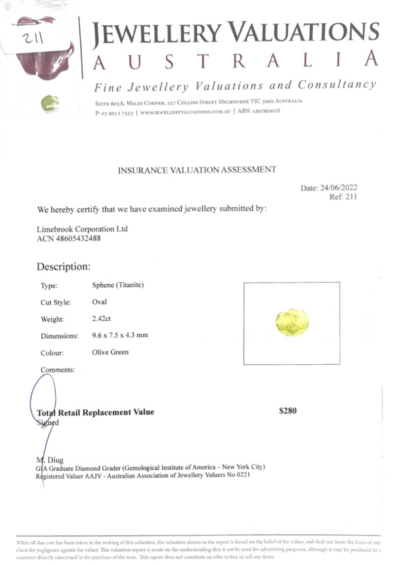 2.42CT OVAL OLIVE GREEN SPHENE. ADDITIONAL OURGIFT2U GIFT CARD $25. Additional Ourgift2U Gift Card $50. Accompanied By Insurance Valuation Assessment. Sphene (Titanite) Oval Cut. Colour: Olive Green. Dimensions: Height: 9.60mm, Width: 7.50mm, Depth: 4.30mm Condition: Good - Refer To Images This valuation has been conducted by an independent third-party professional. The valuation amount is an assessment by the issuing valuer and does not reflect the auction value of the item. Any inquiries regarding the valuation should be directed to the issuing valuer (refer to contact details on the certificate), as Lloyds Auctions has no affiliation or influence over the valuation, the valuer, or the stated amount. Insurance Replacement Valuation Amount: $280.00 FC 162991+4