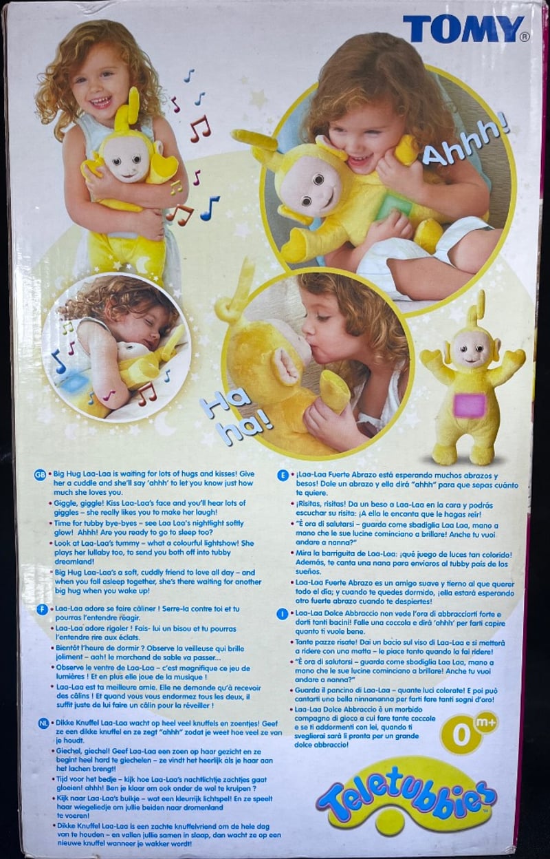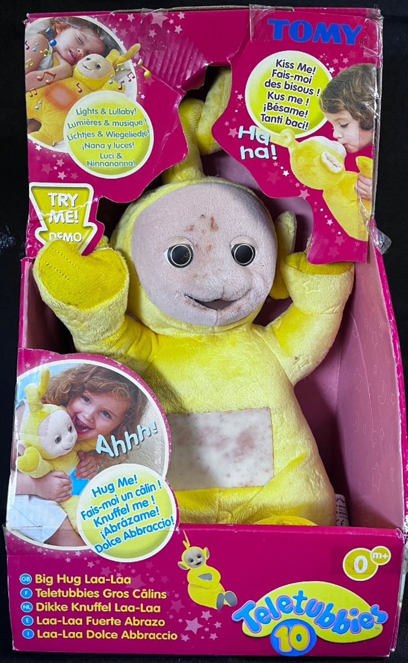TELETUBBIES BIG HUG LAA-LAA INTERACTIVE PLUSH TOY BY TOMYTomy Teletubbies Big Hug Laa-Laa Plush Toy Featuring Yellow Fabric Construction With Embroidered Facial Features. Interactive Toy Produces Lights, Lullaby Music, And Hugging Sounds When Activated. Includes Soft Fabric Arms Designed For Cuddling.Condition: Good - Refer To Images584548+11