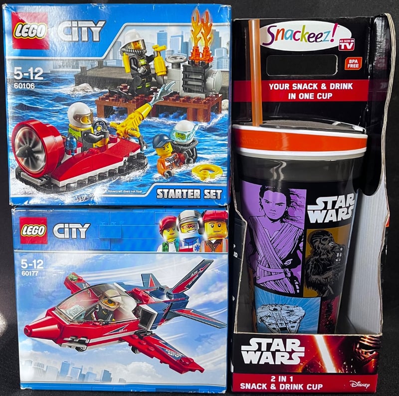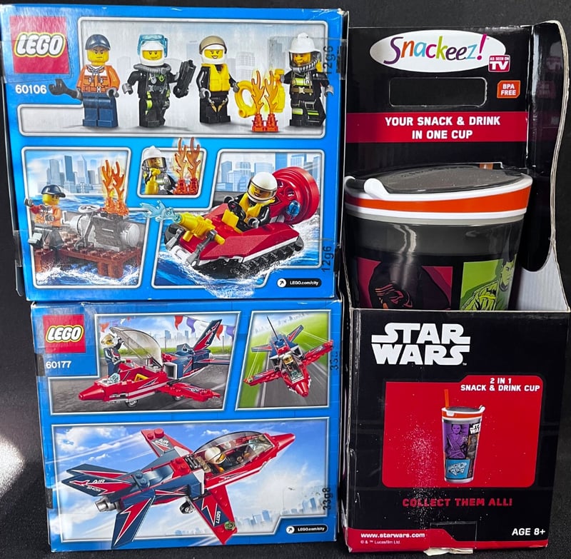 LEGO CITY FIRE RESCUE STARTER SET 60106, LEGO JET 60177 AND STAR WARS SNACKEEZ CUPSLot Comprising Two Lego City Sets (60106 Fire Rescue Starter Set Featuring Firefighter Minifigures, Water-Based Rescue Platform With Red Jet Ski, And Flame Elements; 60177 Fire Jet With Red Aircraft And Pilot Minifigure) Plus Star Wars 2-In-1 Snackeez Snack And Drink Cups With Character GraphicsCondition: Good - Refer To Images584548+19