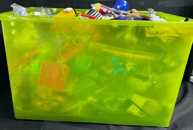 LARGE LOT OF ASSORTED TOYS, GAMES, AND COLLECTIBLES IN NEON YELLOW STORAGE BINSCondition: Good - Refer To Images584548+25