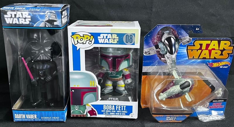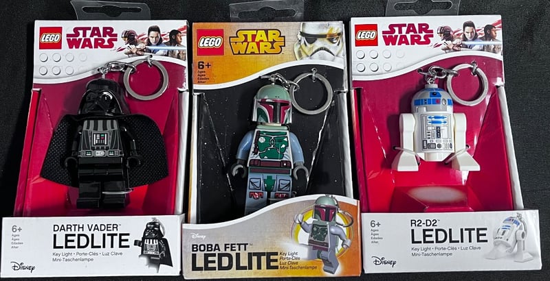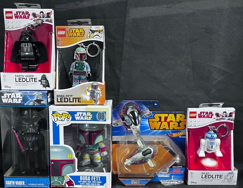 LEGO STAR WARS COLLECTIBLE FIGURES AND ACCESSORIES COLLECTIONComprehensive Collection Of Lego Star Wars Merchandise Comprising Multiple Character Keychains And Collectible Figures. Includes Darth Vader Led Lite Keychain With Illuminated Function, Boba Fett Led Lite Keychain, R2-D2 Led Lite Keychain With Light And Sound Features, Boba Fett Funko Pop Vinyl Figure (Series 2, #08), Darth Vader Bobble-Head Figure, Hot Wheels Die-Cast Slave I Starship Vehicle, And Additional Lego Star Wars Minifigure Keychains. Items Feature Official Disney And Lego Branding WiCondition: Good - Refer To Images584548+27