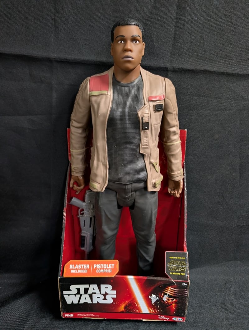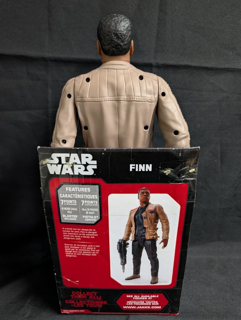 STAR WARS FINN ACTION FIGURE - THE FORCE AWAKENS COLLECTIBLEItem Size: Height: 50cm, Width: 30cm, Depth: 30cm, Weight: 2KgHasbro Star Wars The Force Awakens Finn Action Figure Featuring Authentic Tan/Beige Jacket With Red Accents, Grey Thermal Shirt, And Dark Trousers. Includes Blaster Pistol Accessory. Figure Displays Articulation At 7 Points With Detailed Sculpting. Original Packaging Intact With Character Description And Product Information Visible. Condition Shows Minor Wear Consistent With Display And Storage.Condition: Good - Refer To Images584548+49