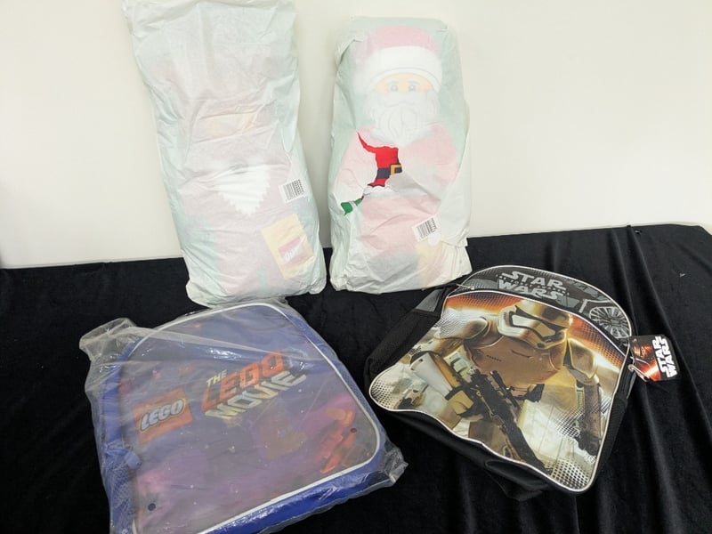 VINTAGE LICENSED CHARACTER BACKPACKS AND ACCESSORIES BUNDLEItem Size: Height: 40cm, Width: 35cm, Depth: 35cm, Weight: 2KgCollection Of Four Licensed Character Backpacks Including Star Wars The Force Awakens Stormtrooper Design, Lego Movie Themed Pack, And Festive Santa Claus Printed Bags. Items Remain Sealed In Original Plastic Packaging, Featuring Vibrant Graphics And Durable Construction. Includes Coordinating Star Wars Lunch Bag With Stormtrooper Imagery. Suitable For Children'S Use Or Collectors Of Licensed Merchandise From Mid-2010S Era.Condition: Good - Refer To Images584548+56