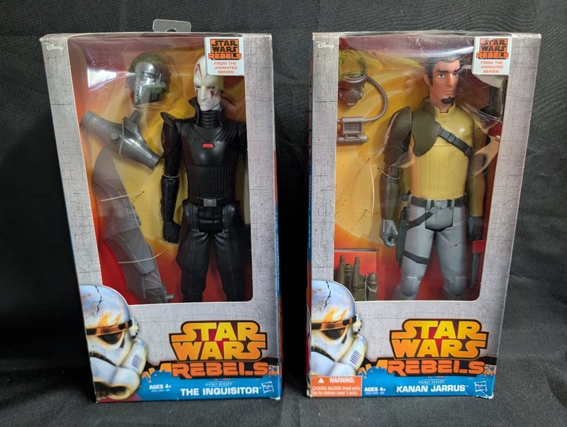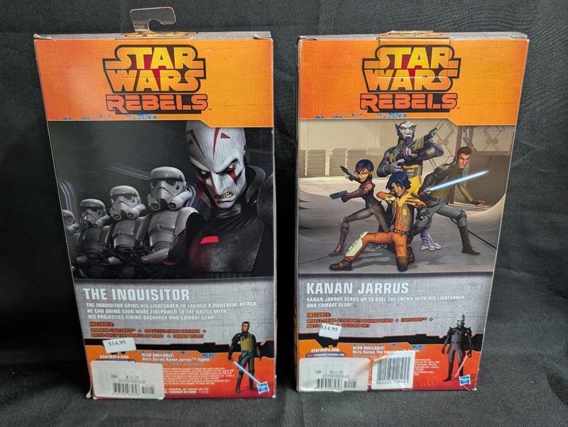 STAR WARS REBELS ACTION FIGURE COLLECTION - THE INQUISITOR & KANAN JARRUS BOXED SETItem Size: Height: 30cm, Width: 12cm, Depth: 8cmPair Of Unopened Star Wars Rebels Action Figures From Hasbro'S Animated Series Collection, Featuring The Inquisitor In Black Tactical Suit With Helmet Accessory And Kanan Jarrus In Yellow Tunic With Combat Gear. Both Figures Retain Original Packaging With Character Artwork And Biographical Information. Includes Articulated Limbs And Accessories. Retail Pricing Visible At $14.95 Per Figure.Condition: Good - Refer To Images584548+64