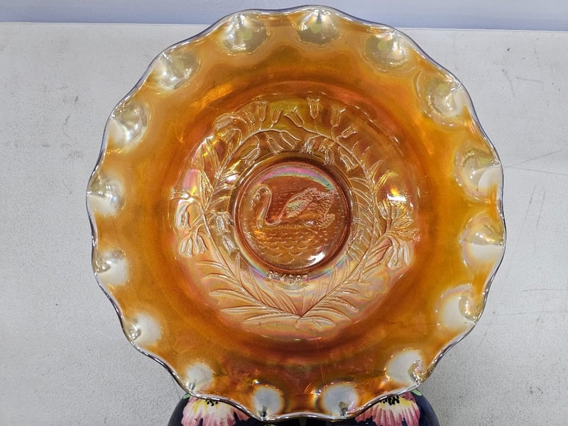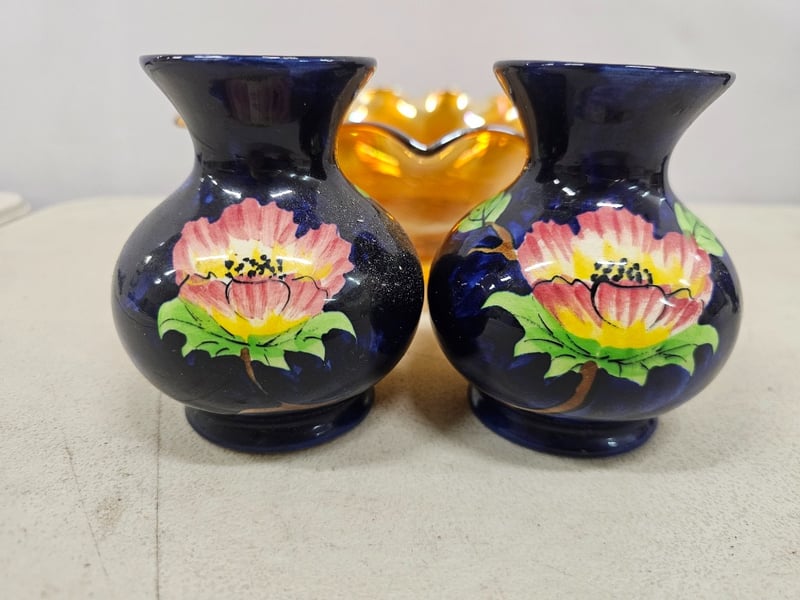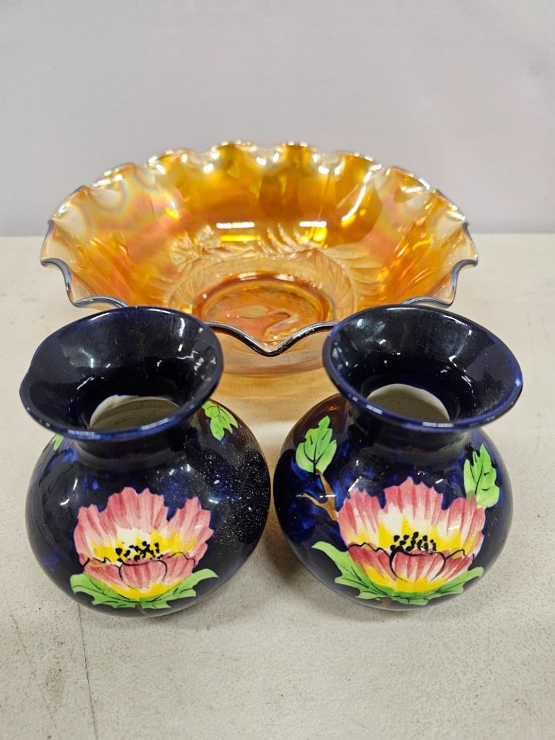 VINTAGE CARNIVAL GLASS BOWL WITH PAIR OF HAND-PAINTED CERAMIC VASESItem Size: Height: 12cm, Width: 33cm, Depth: 25cm, Weight: 1KgCondition: Good - Refer To Images587948+9