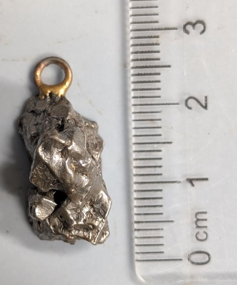 CAMPO DEL CIELO IRON METEORITE MADE INTO A PENDANTCampo Del Cielo Is A Special Meteorite.It Fell 4,000 To 5000 Years Ago And Is Possibly The World`S Largest Meteorite Fall And Hundreds Of Tones Have Been Found – The Largest Individual Weighing More Than 30 Tones (Named The Gancedo Meteorite) .The Strewn Field Is 1000 Kilometers North West Of Buenos Aires In Argentina And It Measures 18.5 X 3 Kilometers And Contains At Least 26 Craters - The Largest Being 115 By 91 Meters.In 1576 The Local Natives Had Iron Tools And Weapons Made From Iron - Even Though The Natives Did Not Have The Ability To Make Iron.The Governor In Northern Argentina Got The Military To Search For The Mass Of Iron That The Natives Used To Make Their Weapons In A Place That The Natives Called “Pygeum Nonralta”,Which The Spanish Translated As Campo Del Cielo (``Field Of Heaven (Or The Sky)``).The Search Found Metal Protruding Out Of The Soil And Collected A Few Samples, Which Were Described As Being Of Unusual Purity.The Governor Submitted A Report To Spain But It Was Mostly Ignored And Forgotten.In 1774 A Prospector (Searching What Was By Now Legends) Rediscovered A Large Iron Mass That He Believed Was The Tip Of A Iron Vein.He Believed That It Formed In A Volcanic Eruption And Abandoned It As Worthless But Sent Samples To The Royal Society In London Who Deemed It Meteoritic In Origin.Many Tens Of Thousands Of Specimens Have Since Been Recovered Ranging From Small Sub Gram Specimens To Tones.The Meteorite Fell In A Swampy Area And When Found Generally Are Covered In A Black Weathered Iron Shale.This Campo Has Been Soaked In Acid Which Removes All Of The Iron Shale Leaving Just The Remaining Solid Meteorite.That Is Why This Campo Is So Nice Even Though It Has Been Soaking And Weathering Away In A Swamp For Thousands Of Years.It Is Officially Classified As Classified As A Iab Octahedrite. Condition: Good - Refer Images584556+2