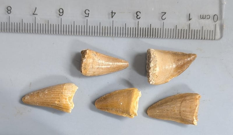 FIVE 70 MILLION YEAR OLD FOSSIL MOSASAUR TEETH FROM MOROCCODug Out Of The Phosphate Mines In Morocco. Mosasaur'S Grew To Twenty Metres In Length With A Two Metre Mouth And Were Apex Predators That Would Have Terrorised The Cretaceous Seas. In One Of The Jurassic Park MoviesA Mosasaur Jumps Out Of A Theme Park Aquarium And Eats A Shark Whole.Condition: Good - Refer Images584556+5