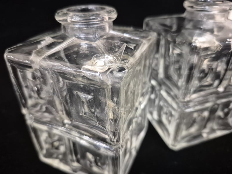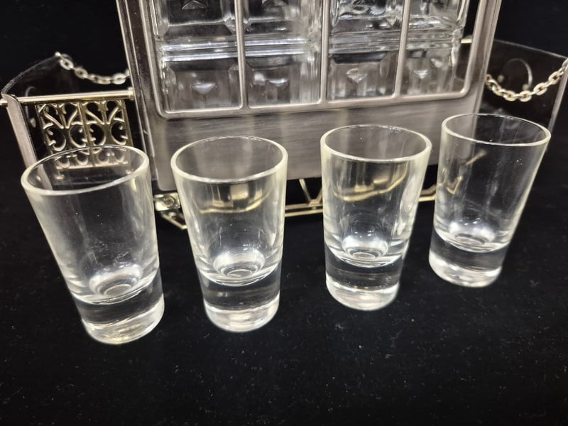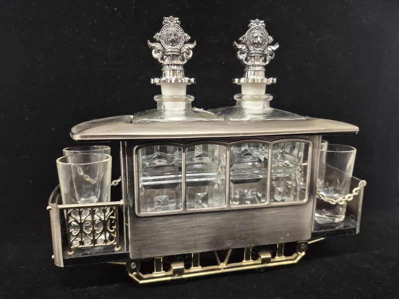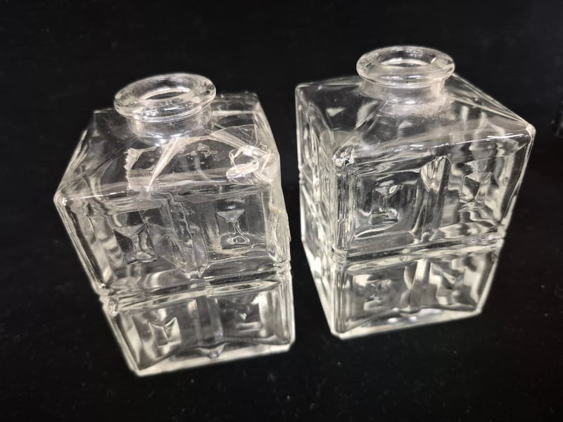DECANTER SET WITH LION HEAD FINIALS NOTE: ONE DECANTER IS DAMAGED, REFER TO PHOTOS Item Size: Height: 28cm, Width: 32cm, Depth: 15cm, Weight: 4Kg Condition: Fair - Refer To Images 587964+1