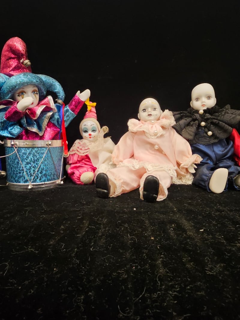 4 CLOWN DOLLS Item Size: Height: 26cm, Width: 10cm, Depth: 10cm, Weight: 3Kg Doll Heights Range From 26Cm - 19Cm Condition: Good - Refer To Images 587964+16
