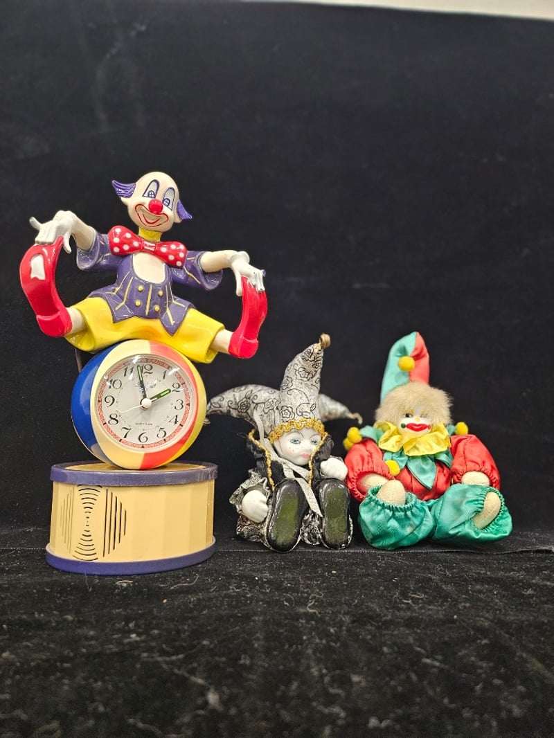 3 CLOWN DOLLS Item Size: Height: 28cm, Width: 20cm, Depth: 20cm, Weight: 2Kg Dolls Heights Range From 28Cm - 16Cm Condition: Good - Refer To Images 587964+18