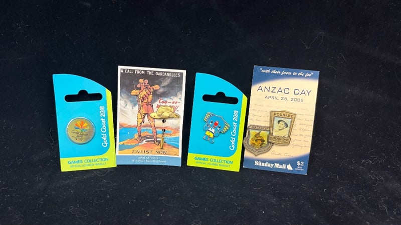 COLLECTION OF PINS. Item Size: Height: 10cm, Width: 8cm, Depth: 2cm Including Gold Coast 2018, Anzac Day 2006, Wwi Recruiting 1915. Condition: Good - Refer To Images 587964+45