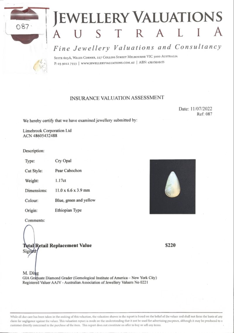 1.17CT CRY OPAL. ADDITIONAL GIFT CARD $25, OURGIFT2U. Accompanied By Insurance Valuation Assessment And $25 Gift Card, Ourgift2U. Cut Style: Pear Cabochon. Colour: Green. Origin: Ethiopian Type. Dimensions: Height: 11.00mm, Width: 6.60mm, Depth: 3.90mm Condition: Good - Refer To Images This valuation has been conducted by an independent third-party professional. The valuation amount is an assessment by the issuing valuer and does not reflect the auction value of the item. Any inquiries regarding the valuation should be directed to the issuing valuer (refer to contact details on the certificate), as Lloyds Auctions has no affiliation or influence over the valuation, the valuer, or the stated amount. Insurance Replacement Valuation Amount: $220.00 FC 162991+38