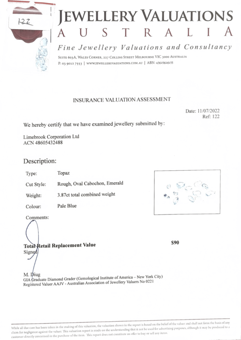 3.87TCW BLUE TOPAZ. ADDITIONAL $25 GIFT CARD, OURGIFT2U. Accompanied By Insurance Valuation Assessment And $25 Gift Card, Ourgift2U. Cut Style: Rough, Oval Cabochon, Emerald. Colour: Pale Blue Condition: Good - Refer To Images This valuation has been conducted by an independent third-party professional. The valuation amount is an assessment by the issuing valuer and does not reflect the auction value of the item. Any inquiries regarding the valuation should be directed to the issuing valuer (refer to contact details on the certificate), as Lloyds Auctions has no affiliation or influence over the valuation, the valuer, or the stated amount. Insurance Replacement Valuation Amount: $90.00 FC 162991+49
