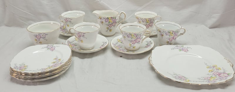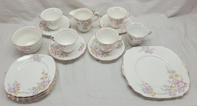 COLDOUGH CHINA ENGLISH FOUR PIECE SETIncludes:6X Cake Plates,1 Large Plate, Milk Jug, Sugar BowlCondition: Good - Refer To Images582891+12