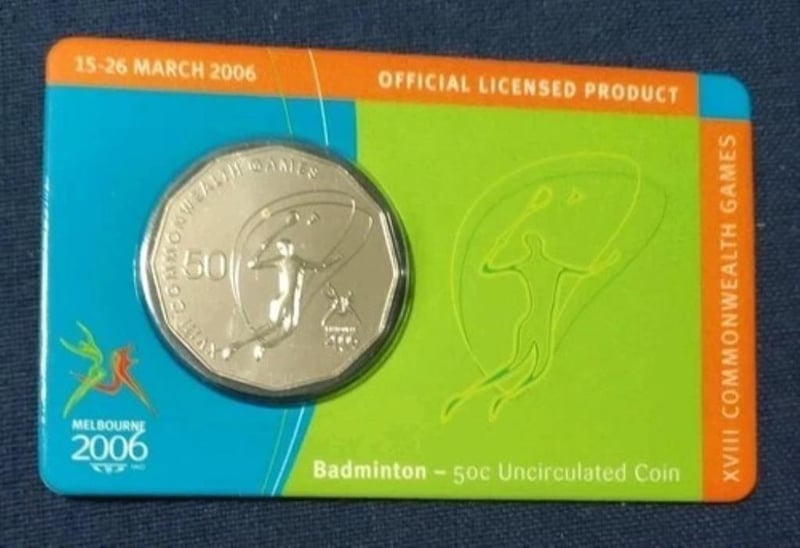 2006 XVIII COMMONWEALTH GAMES "BADMINTON" 50C UNC COIN ON CARD 294179+6