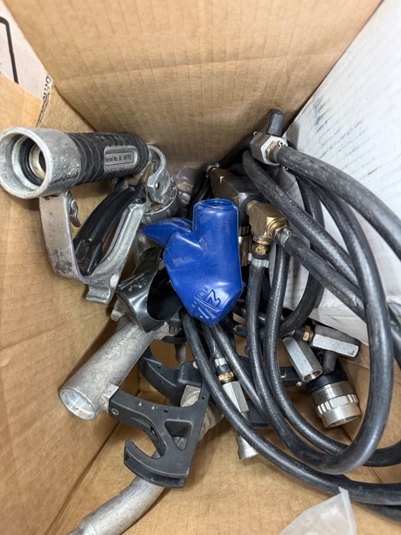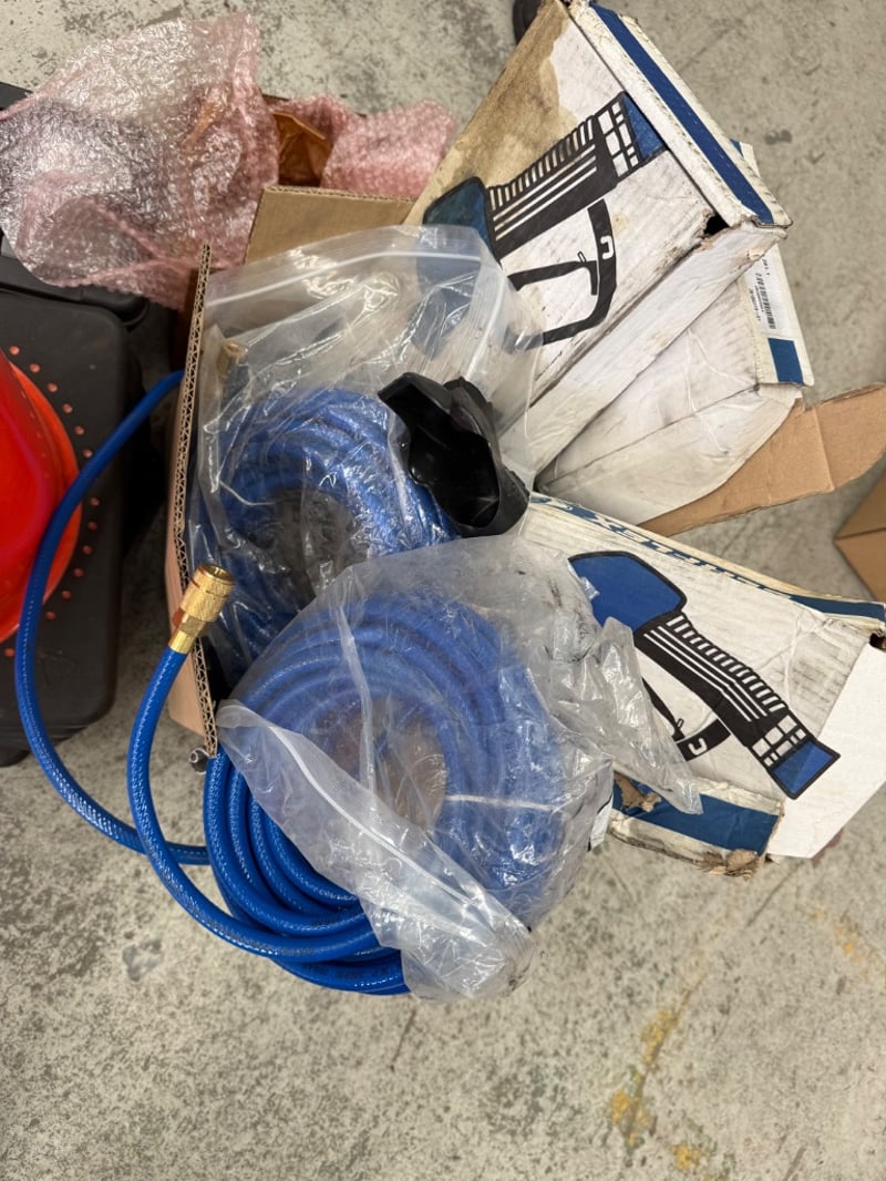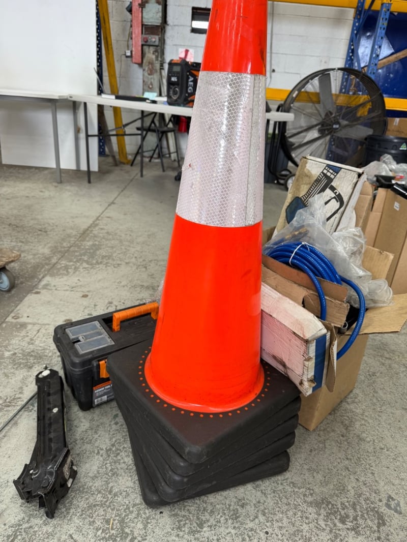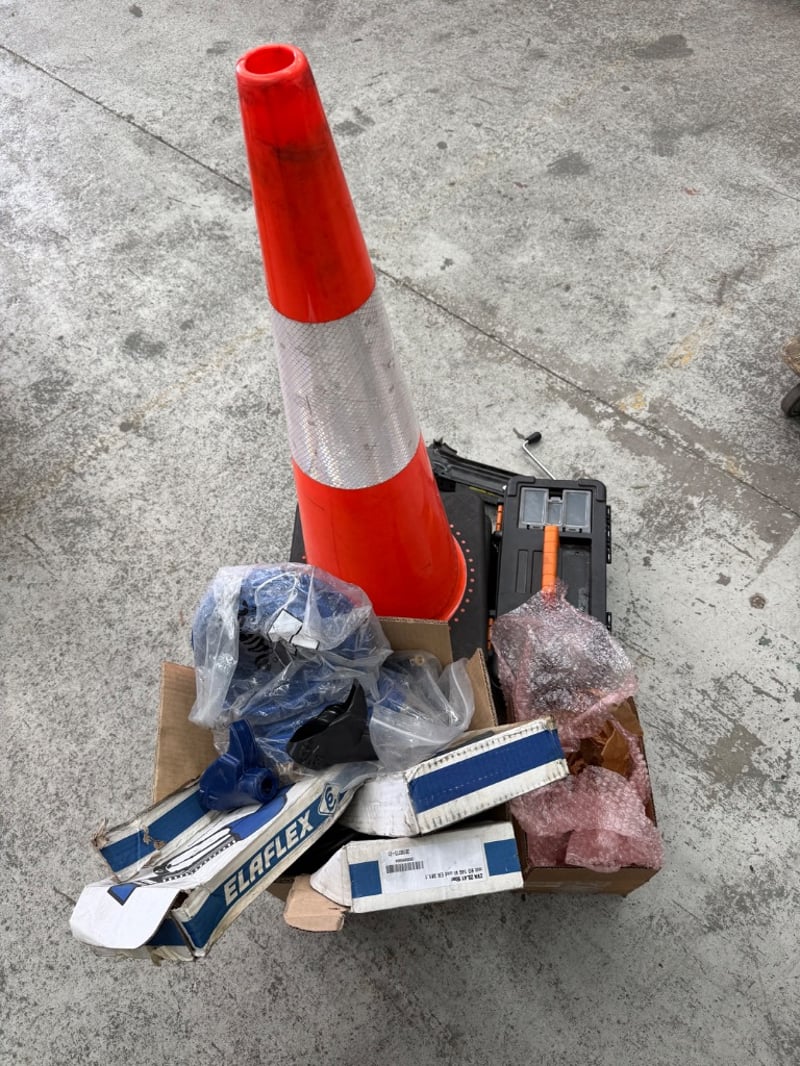Assorted Tools including traffic cones, automatic safety nozzle, assorted hydraulic hose fittings and connectors in various sizes ect. Sold as lot.