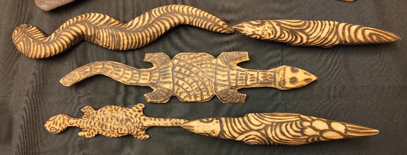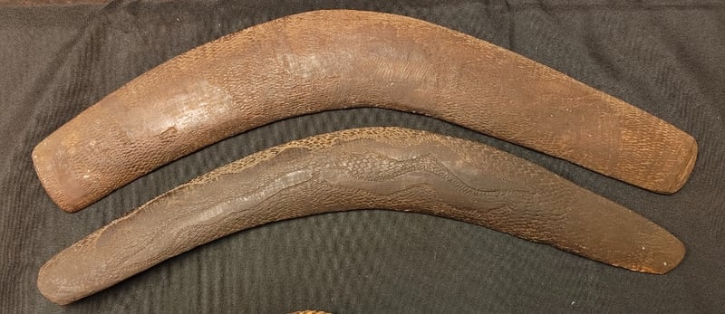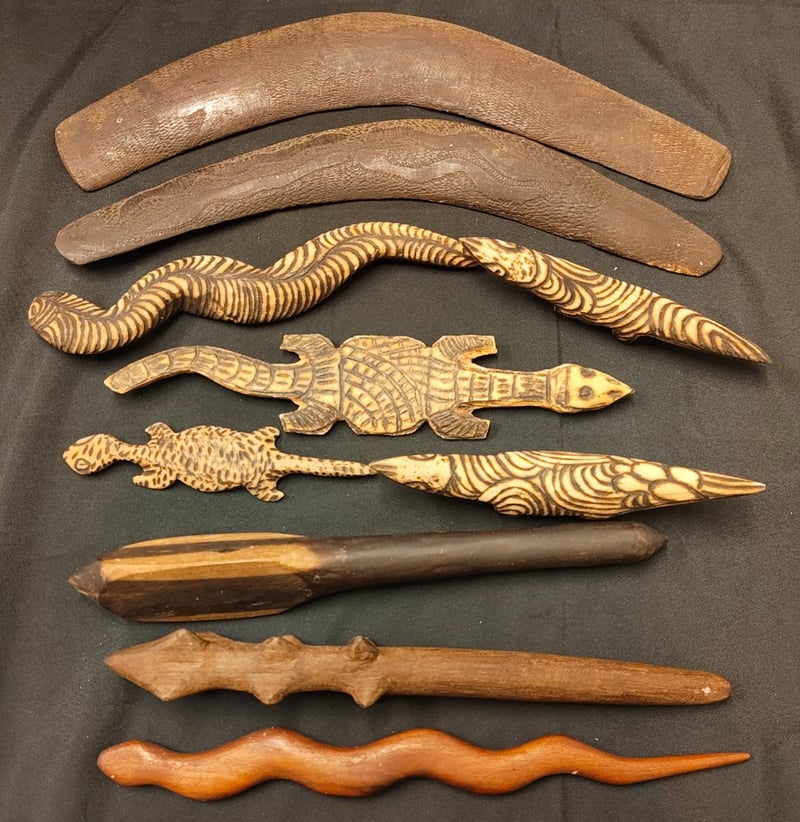 COLLECTION OF ABORIGINAL BOOMERANGS, CARVED ANIMALS AND STICKS 585099+17