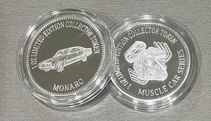1 X ``HOLDEN MONARO`` MUSCLE CAR SERIES 1- 0Z HSE 999 FINE SILVER COIN/TOKEN LIMITED TO ONLY 2,500 WORLD WIDE. An Incredible New Array Of New Designs For Car Lovers, These New Muscle Cars Series Coins/Tokens Are Great To Collect, They Are A 1 Ounce Coin/Token 999 Fine Silver Heavy Gold Electroplate. They Are In Great Fresh Of The Mint Condition. Holden Monaro, Holden Slr 5000 Torana, Ford Gt Falcon, Shelby And Corvette. The Engine Is On The Back Of Each Design. 294179+28
