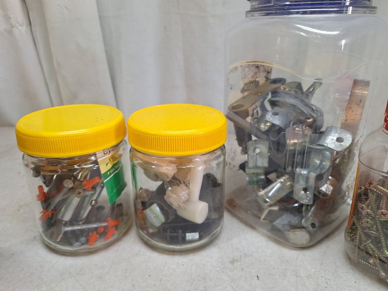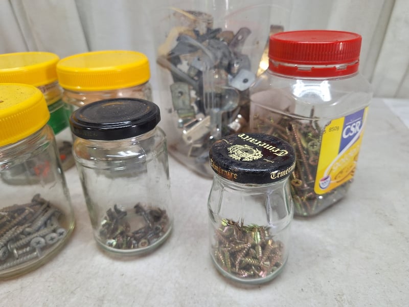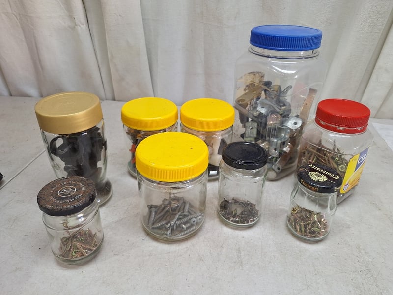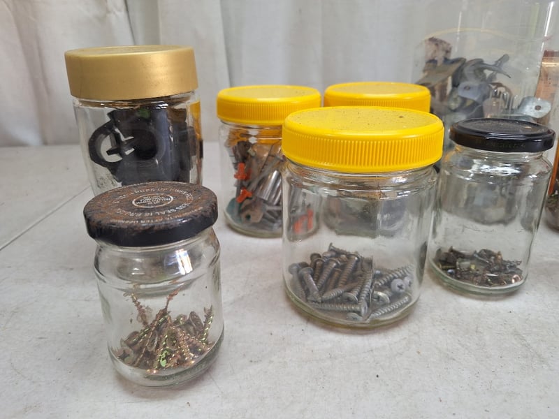 Jars Contain Assorted Hardware Including Screws, Nuts, Bolts, & Fasteners Of Varying Sizes