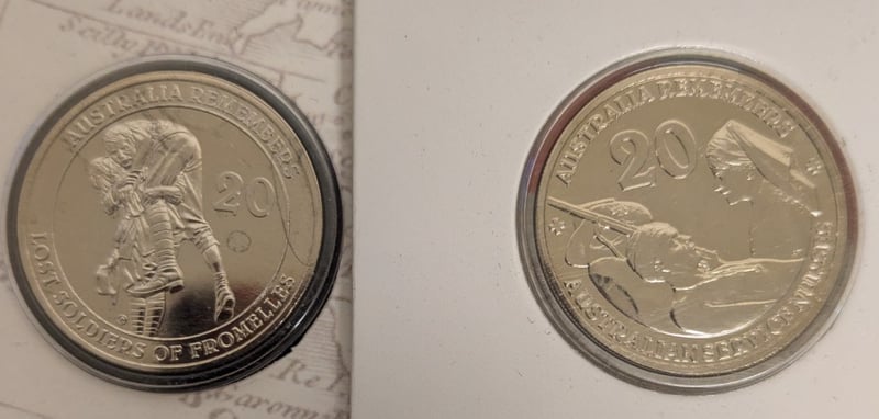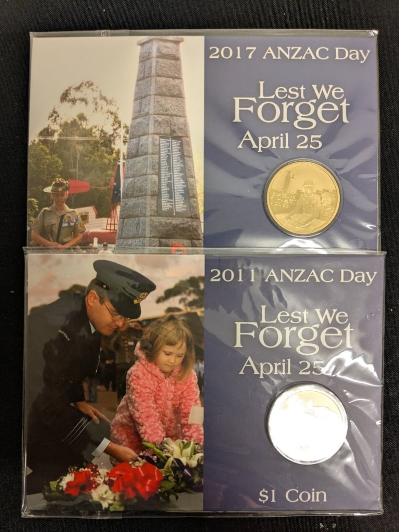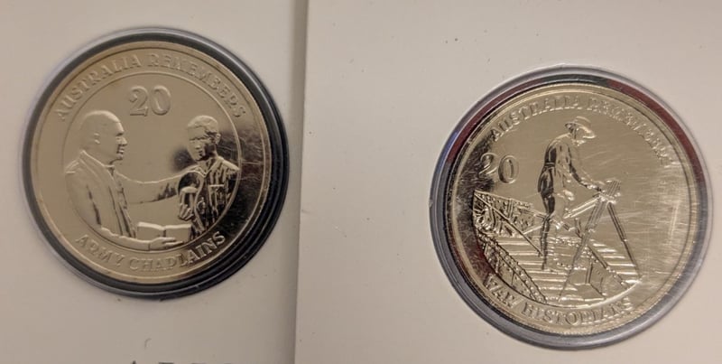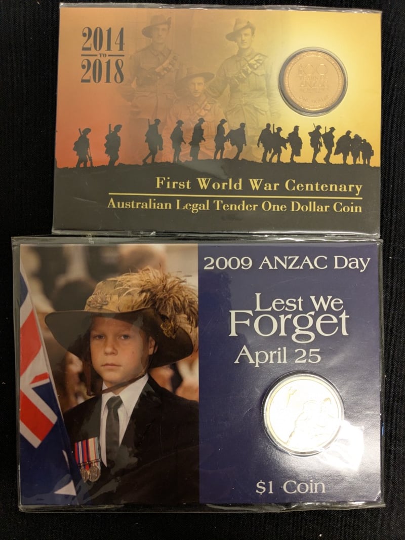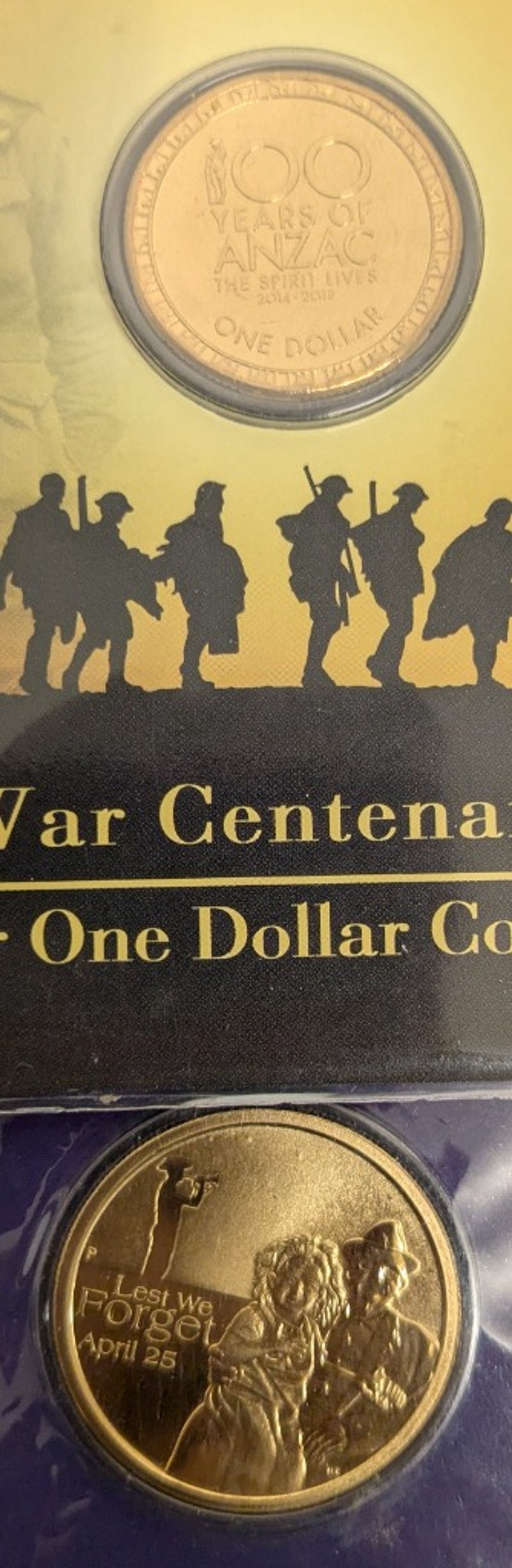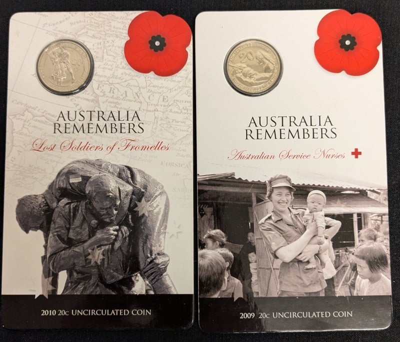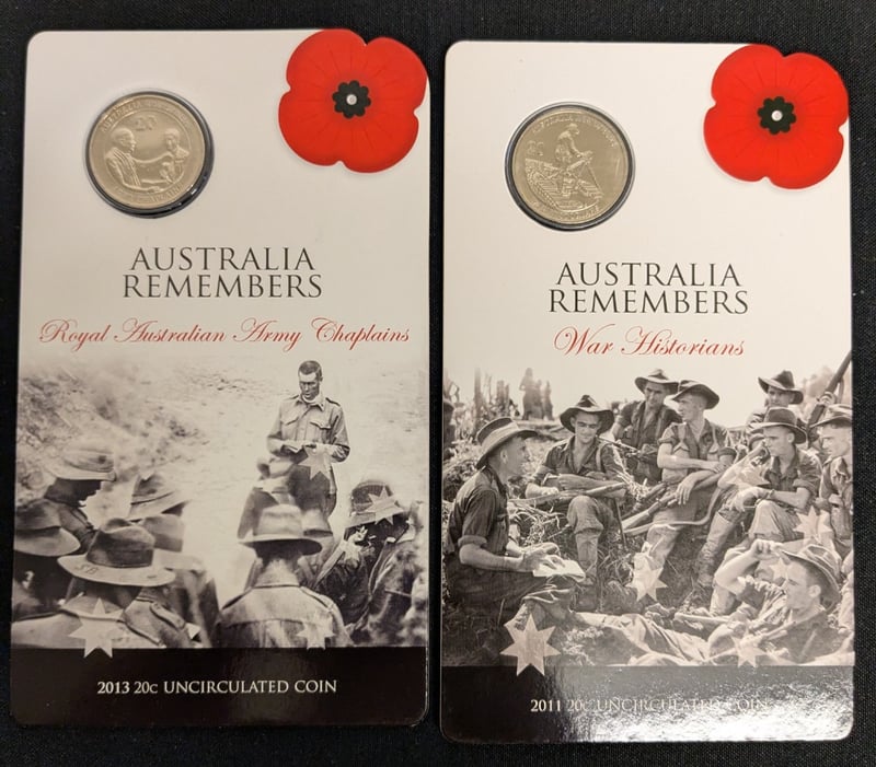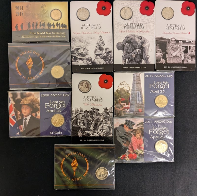 COLLECTION OF MILITARY PNC CARDED UNCIRCULATED COINS Collection Includes Multiple $1 Coins Featuring "Lest We Forget" Inscriptions With Torch And Poppy Imagery (2009, 2011, 2017 Issues), 20-Cent Uncirculated Coins Honouring Lost Soldiers Of Fromelles, Australian Service Nurses, Royal Australian Army Chaplains, And War Historians (2009-2013), Plus A First World War Centenary Australian Legal Tender One Dollar Coin (2014-2018) Condition: Unc 584541+38