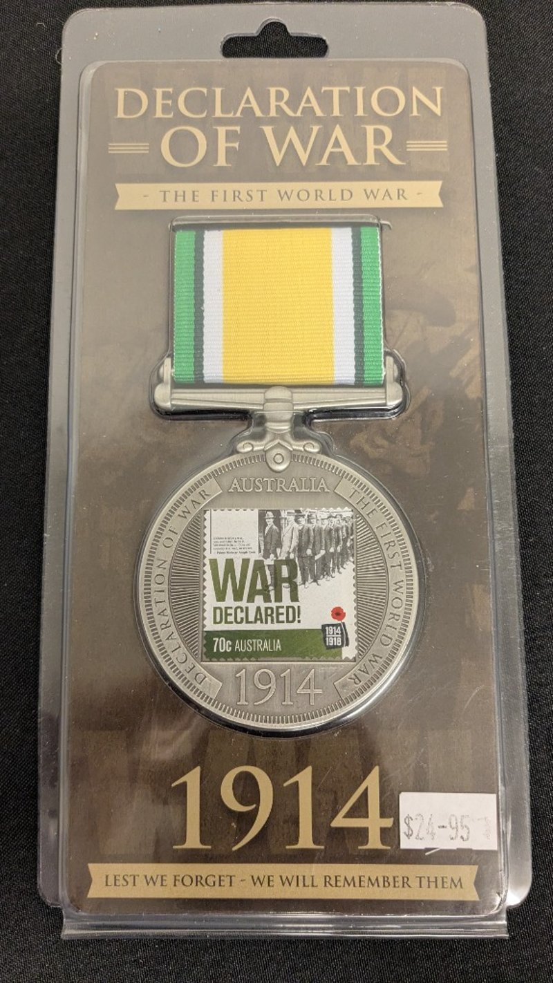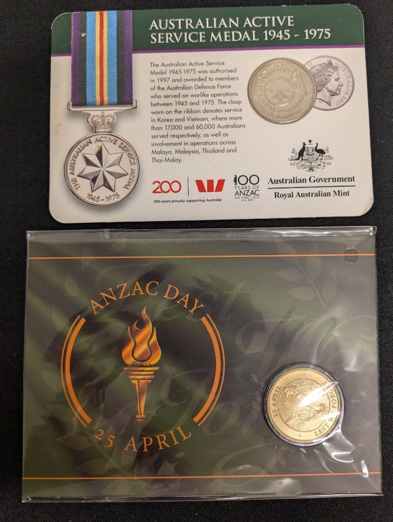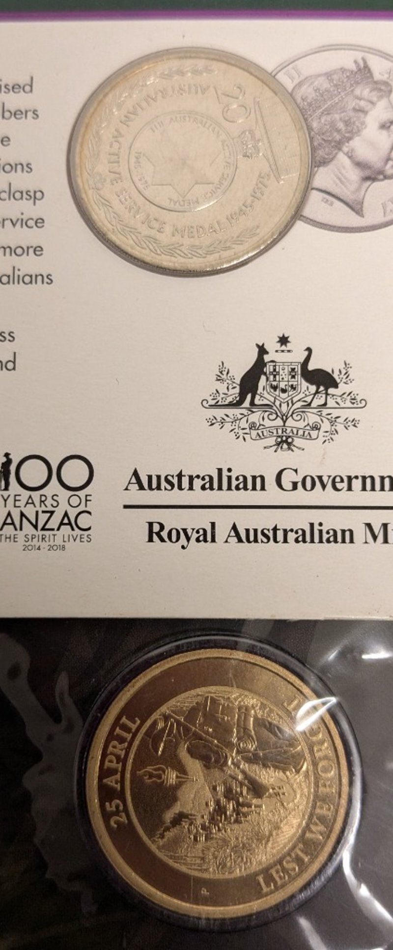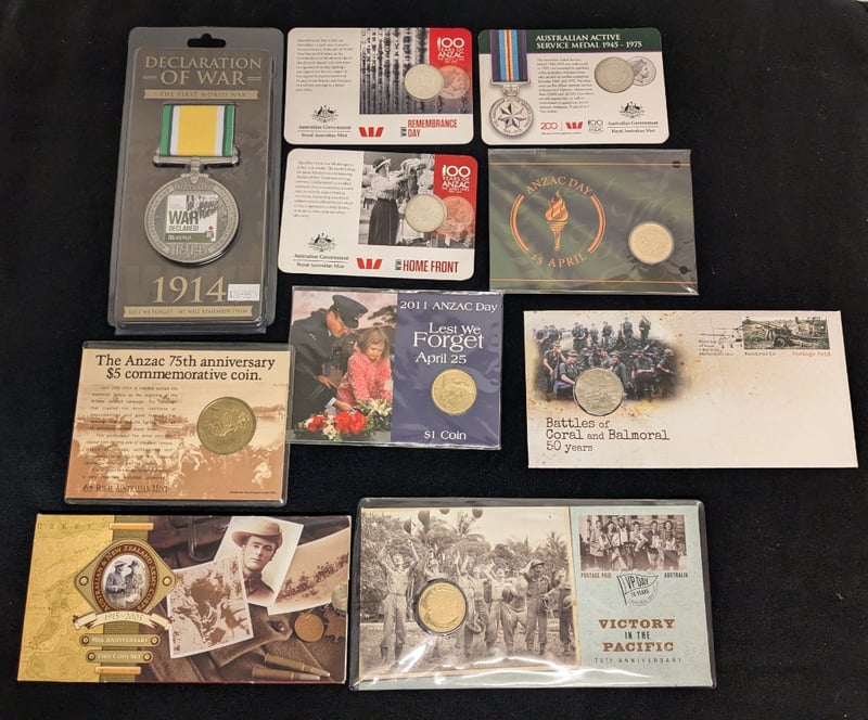COLLECTION OF MILITARY PNC CARDED UNCIRCULATED COINS AND MEDALLIONS Includes 1914 Replica Declaration Of War Medal, 2022 Anzac Day One Dollar Coin, 1945-1975 Australian Active Service Medal, Etc Condition: Aunc 584541+41