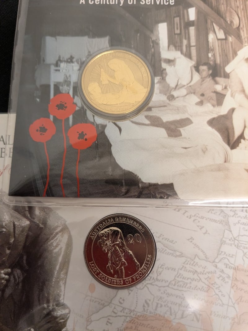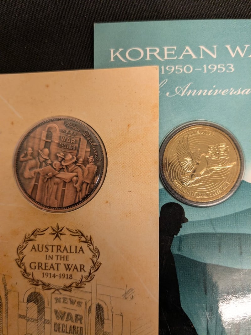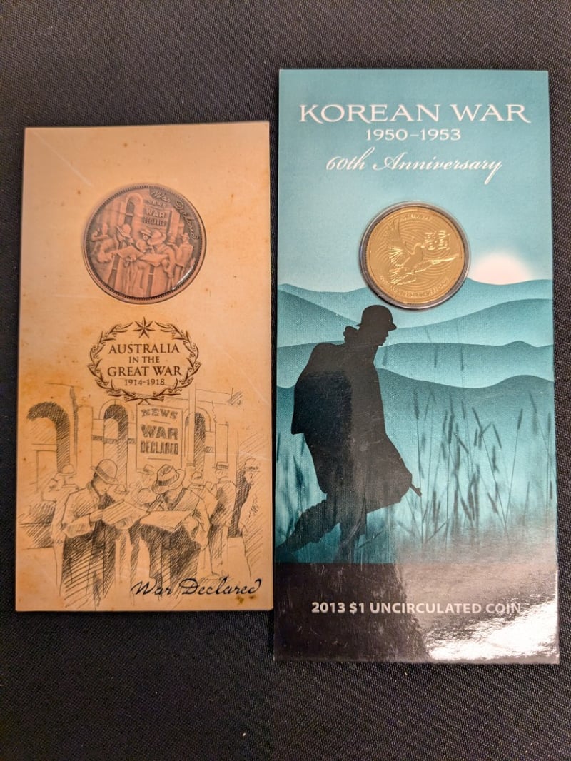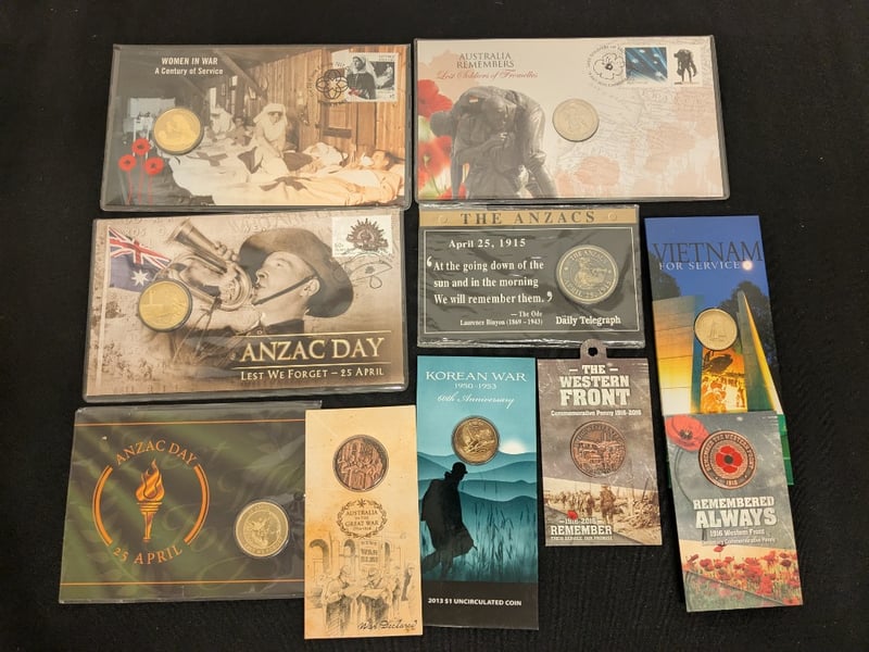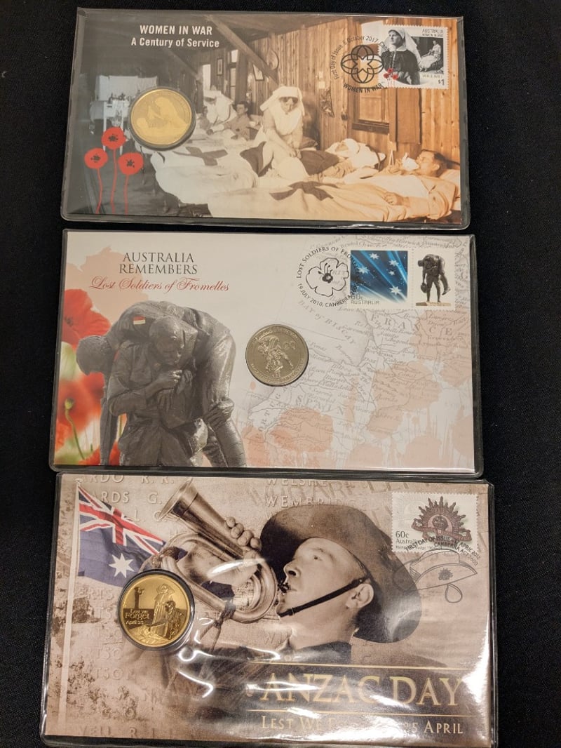 COLLECTION OF MILITARY PNC CARDED UNCIRCULATED COINS AND MEDALLIONS Comprehensive Collection Of Australian Military Commemorative Coins Spanning Major Conflicts And Service Anniversaries. Includes Anzac Day Coins (25 April 1915), Korean War 60Th Anniversary (1950-1953), Vietnam War For Service (1968-1975), Western Front Centenary (1916-2016), Women In War Service Coins, And Lost Soldiers Of Fromelles Commemoration. Features Both Gold And Base Metal Coins In Protective Display Cases With Historical Documentation. Coins Showcase Significant Australian Military Her Condition: Unc 584541+42