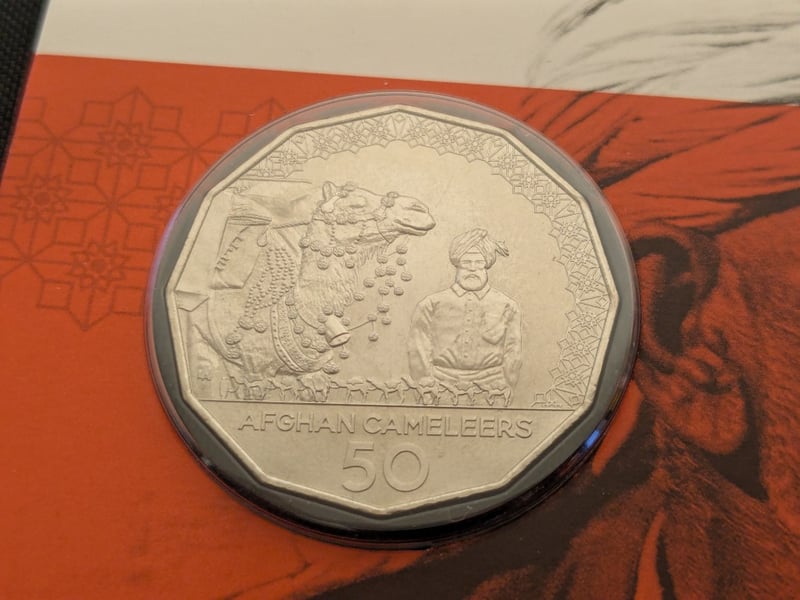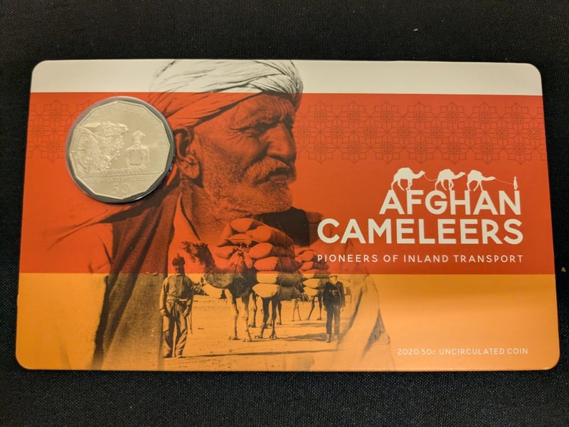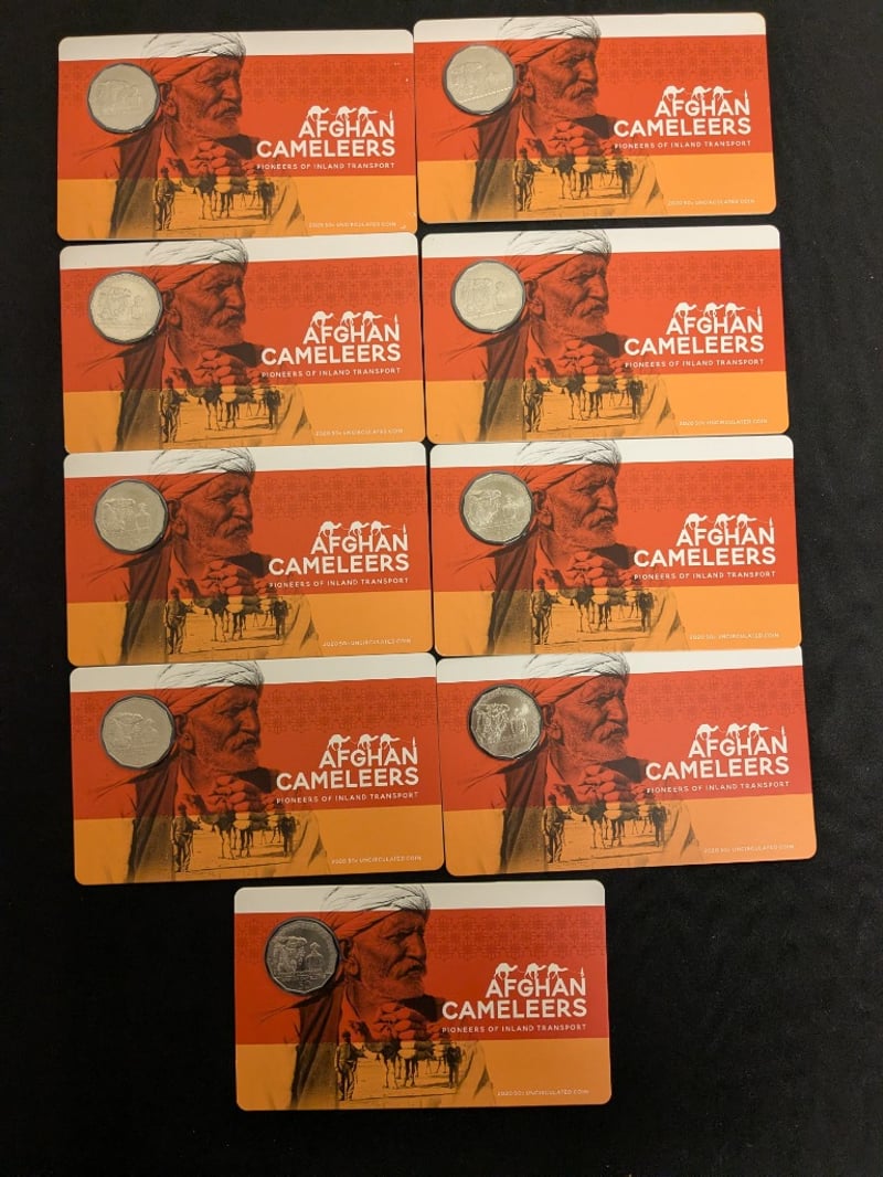 NINE 2020 AFGHAN CAMELEERS 50 CENT UNCIRCULATED CARDED COINS This 2020 Australian 50 Cent Uncirculated Coin Commemorates The Afghan Cameleers, Pioneers Of Inland Transport. The Coin Features A Detailed Reverse Design Depicting A Cameleer With A Laden Camel, Rendered In Fine Relief Against An Ornamental Border. The Obverse Bears The Effigy Of Elizabeth Ii As Inscribed. Presented In Official Cardboard Holder With Orange And Cream Coloring, Featuring Thematic Artwork Of Afghan Camel Handlers. The Coin Exhibits Exceptional Preservation Characteristic Of Uncir Condition: Unc 584541+44