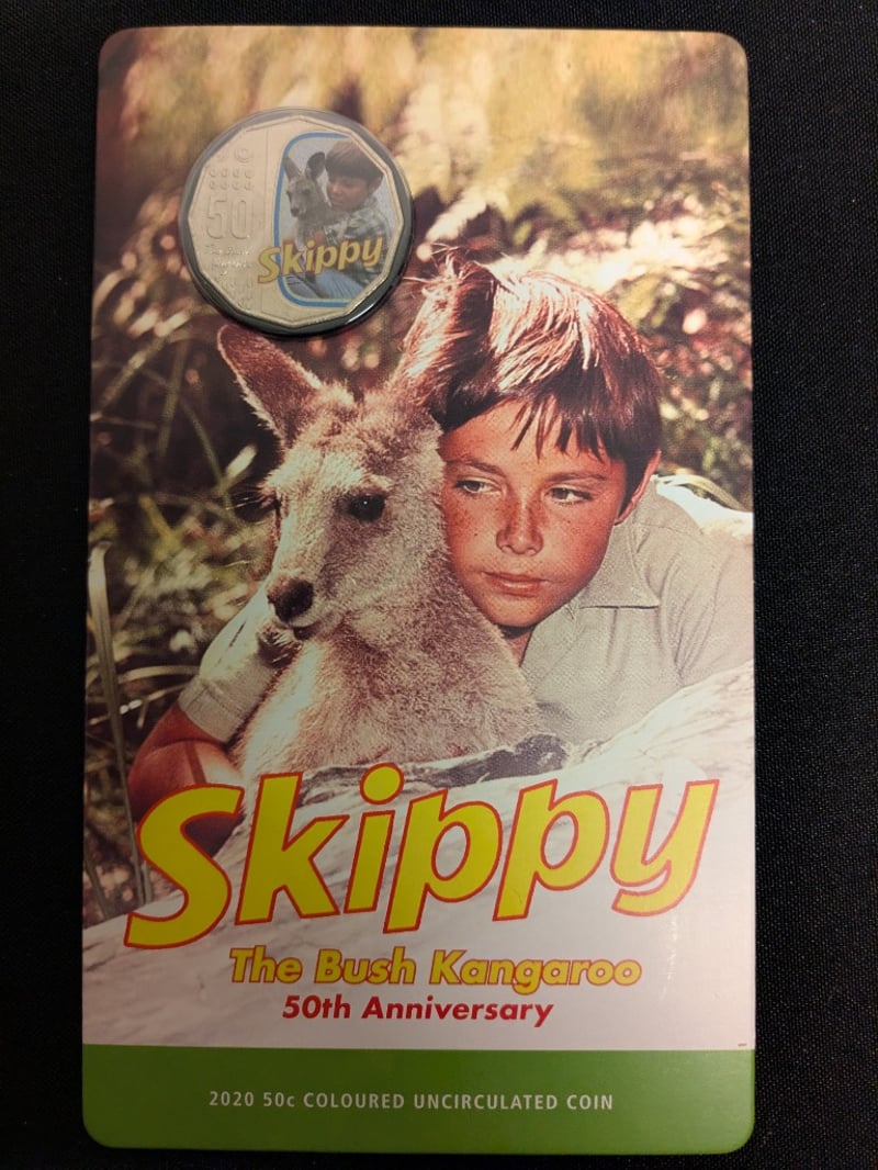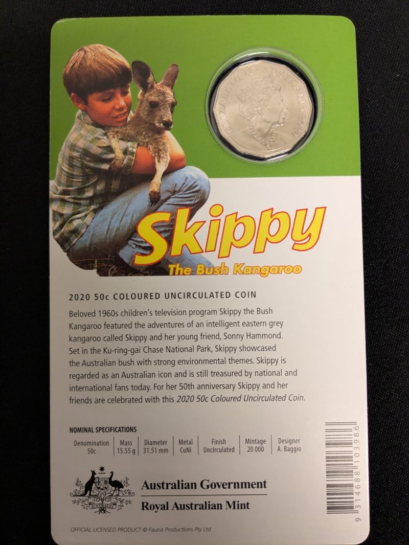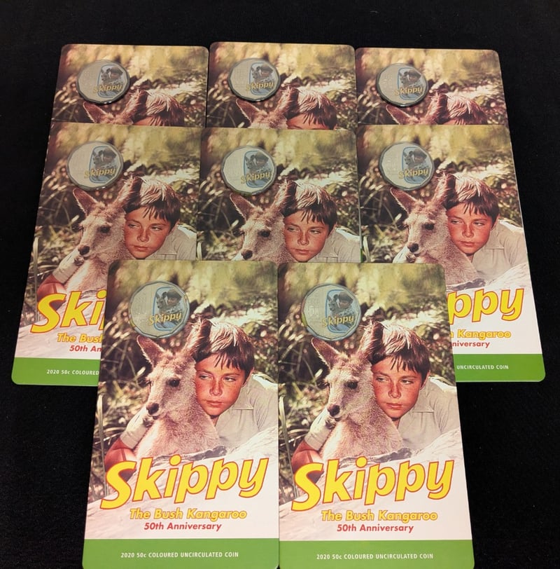 EIGHT 2020 SKIPPY THE BUSH KANGAROO 50C COLOURED UNCIRCULATED COIN - 50TH ANNIVERSARY This Commemorative 50-Cent Piece Celebrates The 50Th Anniversary Of The Beloved 1960S Australian Children'S Television Program "Skippy The Bush Kangaroo." The Coin Features Colourised Imagery Of Skippy With Young Co-Star Sonny Hammond Set Against The Natural Bushland Backdrop Of The Ku-Ring-Gai Chase National Park. Minted In 2020 By The Royal Australian Mint, This Uncirculated Specimen Showcases Exceptional Detail With Vibrant Colour Application Condition: Unc Provenance: Royal Australian Mint 584541+48