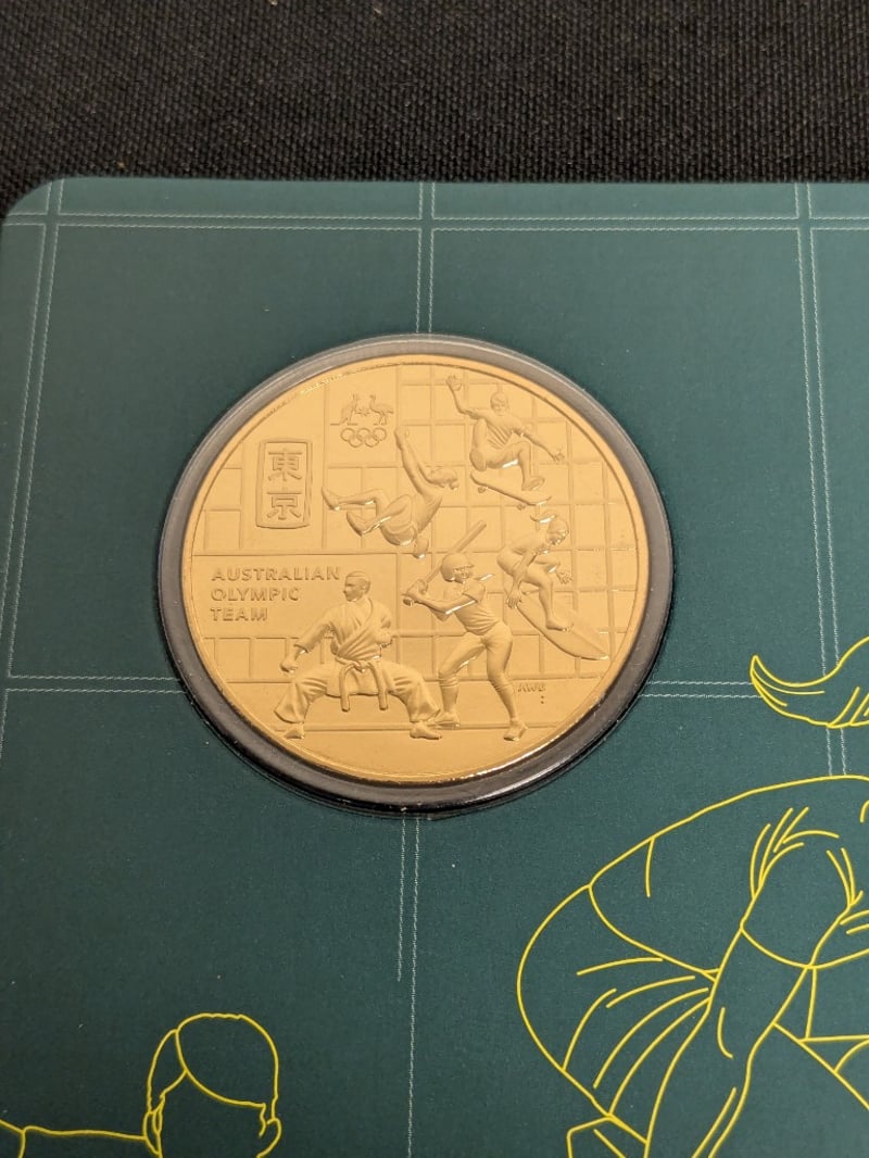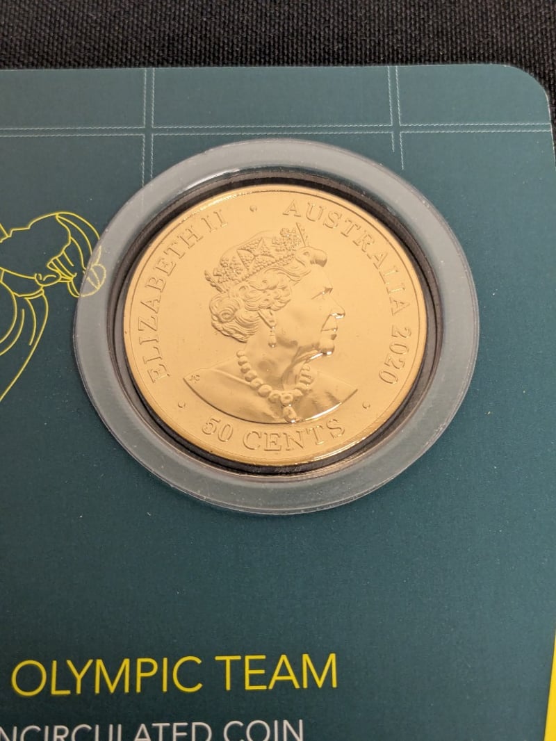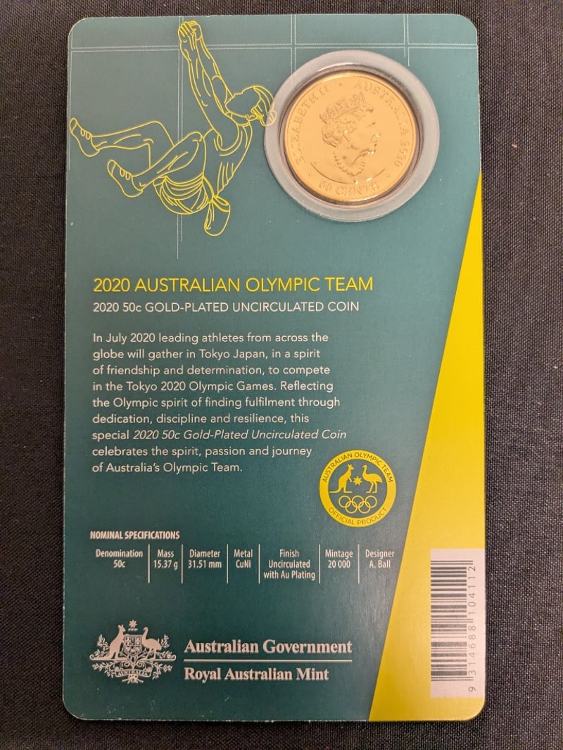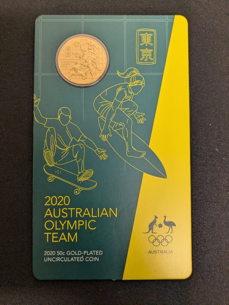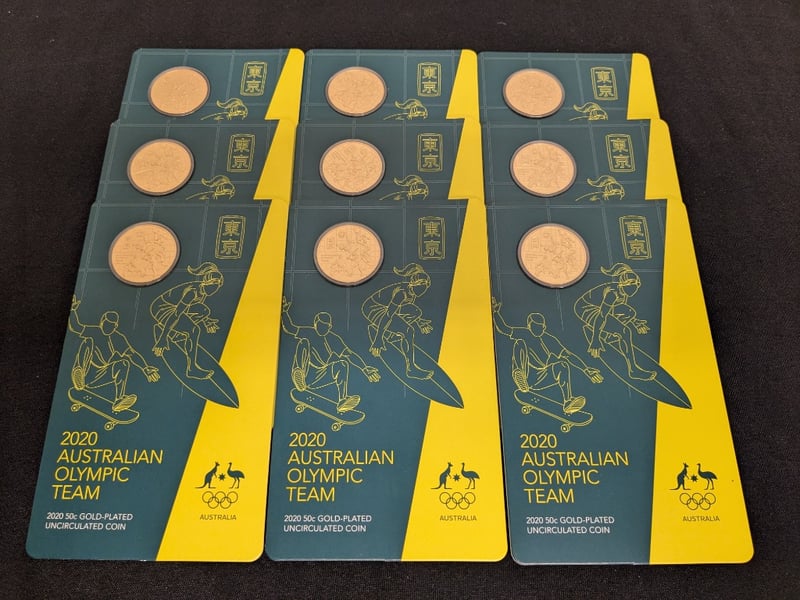 NINE 2020 AUSTRALIAN OLYMPIC TEAM 50 CENTS GOLD-PLATED UNCIRCULATED COINS Exceptional Collection Comprising Nine 2020 Australian Olympic Team Commemorative 50-Cent Gold-Plated Uncirculated Coins. Each Coin Features 15.87G Mass With 31.51Mm Diameter, Finished With Authentic Gold Plating Over Base Metal. The Reverse Displays Dynamic Olympic Athletes Engaged In Various Sports Disciplines, Including Skateboarding And Gymnastics, With Tokyo 2020 Japanese Characters (??) Prominently Featured. Condition: Unc Provenance: Royal Australian Mint 584541+49
