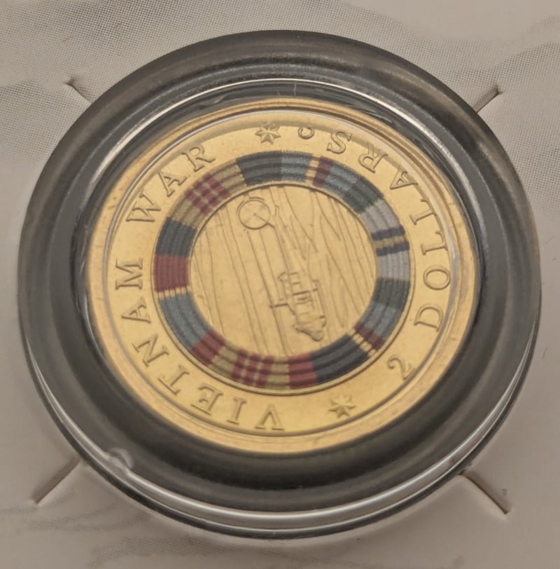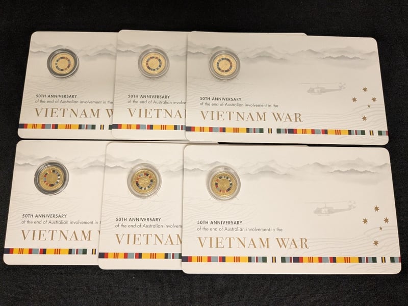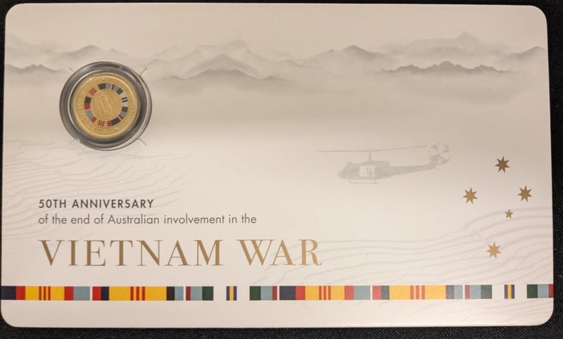 2022 AUSTRALIAN VIETNAM WAR 50TH ANNIVERSARY COMMEMORATIVE COIN COLLECTION A Significant Commemorative Collection Marking The 50Th Anniversary Of The End Of Australian Involvement In The Vietnam War. The Set Comprises Seven Gold-Coloured Coins Presented In Official Presentation Cards Featuring Embossed Mountain Landscapes And Military Helicopter Imagery. Each Coin Displays The Australian Coat Of Arms And Features A Distinctive Coloured Ring Design Incorporating Military Service Ribbons In Red, Yellow, And Grey Tones. Condition: Proof 584541+50