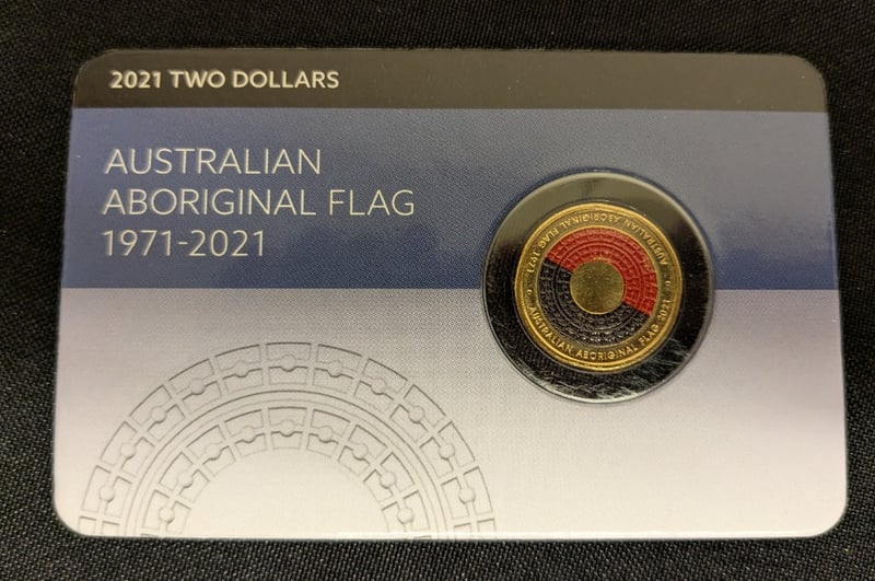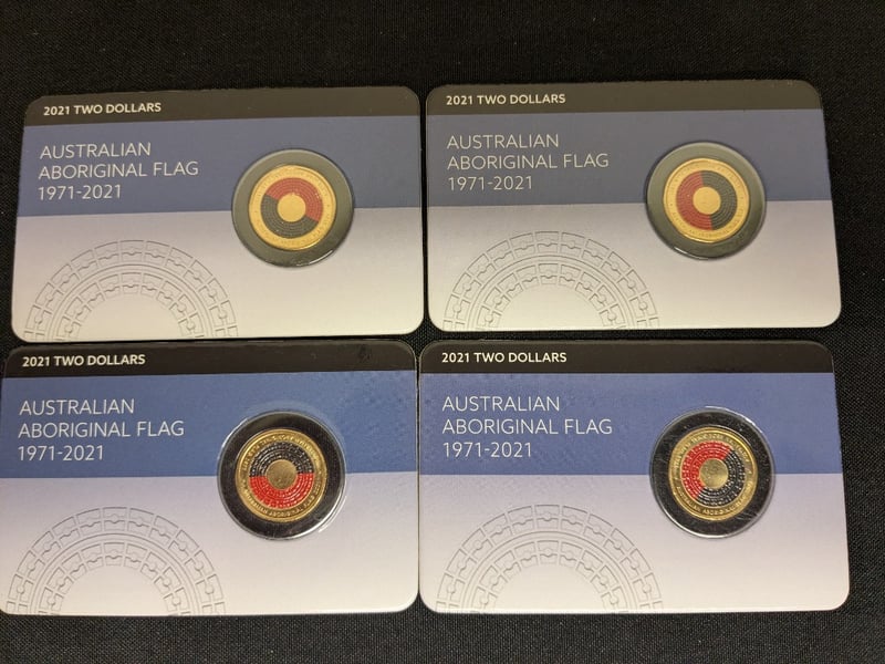 FOUR 2021 AUSTRALIAN ABORIGINAL FLAG COMMEMORATIVE $2 COINS A Comprehensive Five-Piece Collection Commemorating The 50Th Anniversary Of The Australian Aboriginal Flag (1971-2021). Each Coin Features The Iconic Aboriginal Flag Design With Concentric Circles In Red, Black, And Yellow On A Gold-Plated Surface. The Collection Includes Coins In Varying Finishes And Presentations, Showcasing Meticulous Craftsmanship. Condition: Unc 584541+52